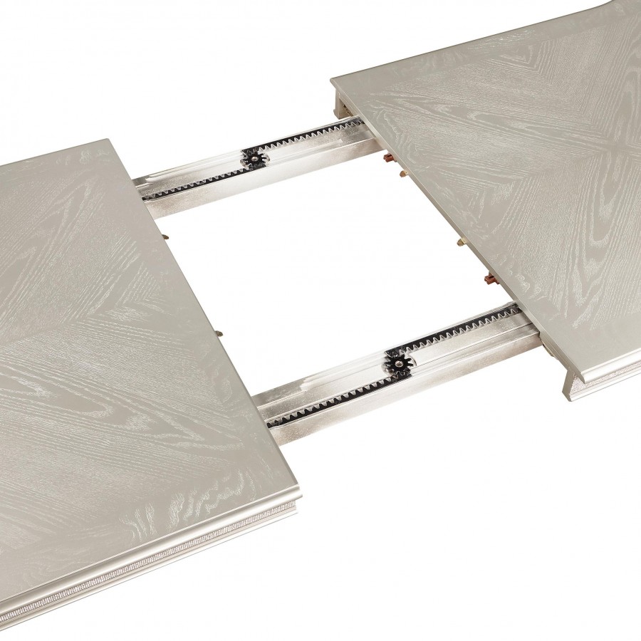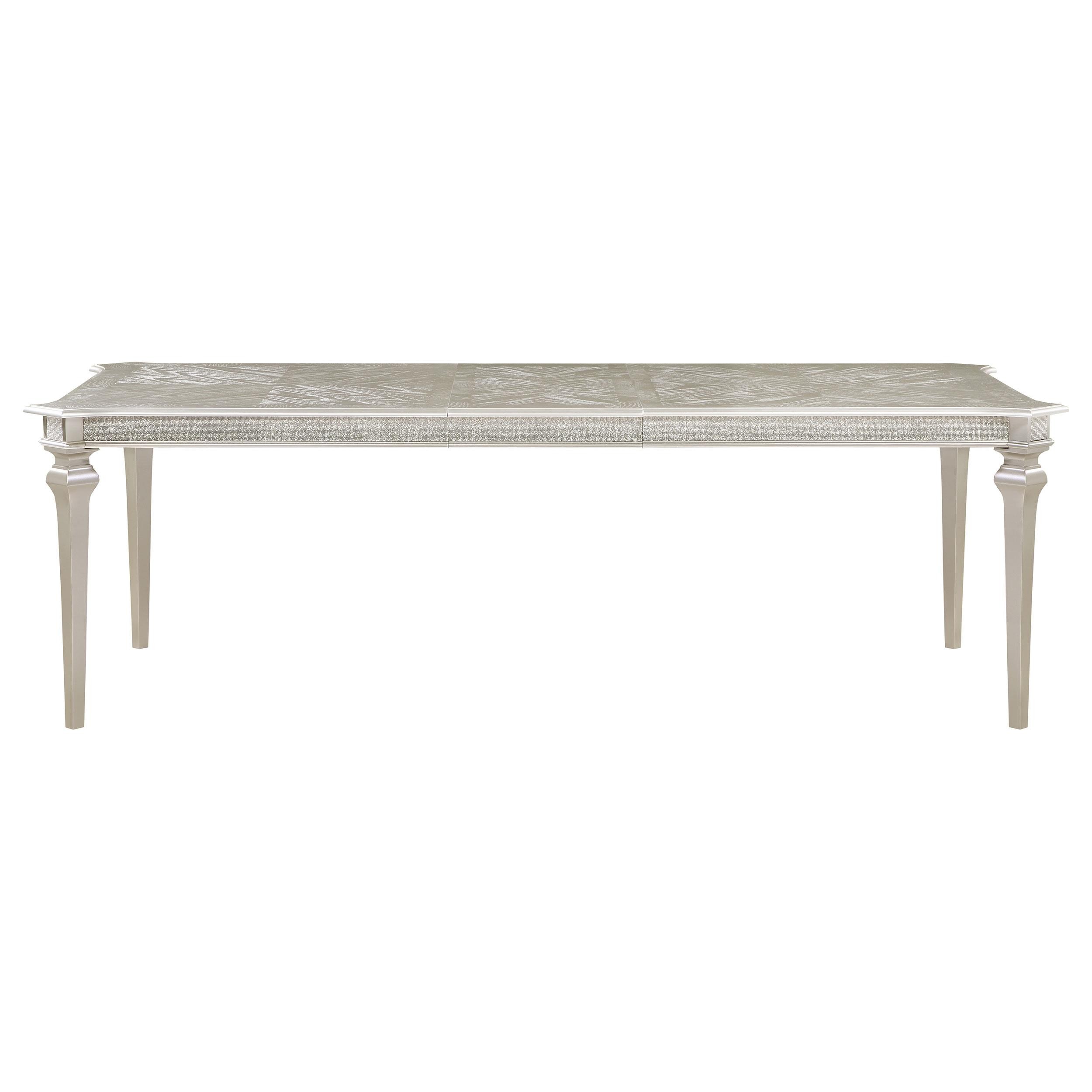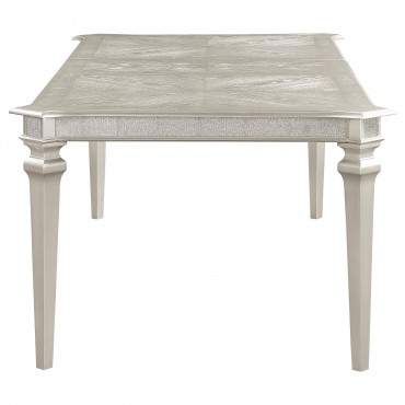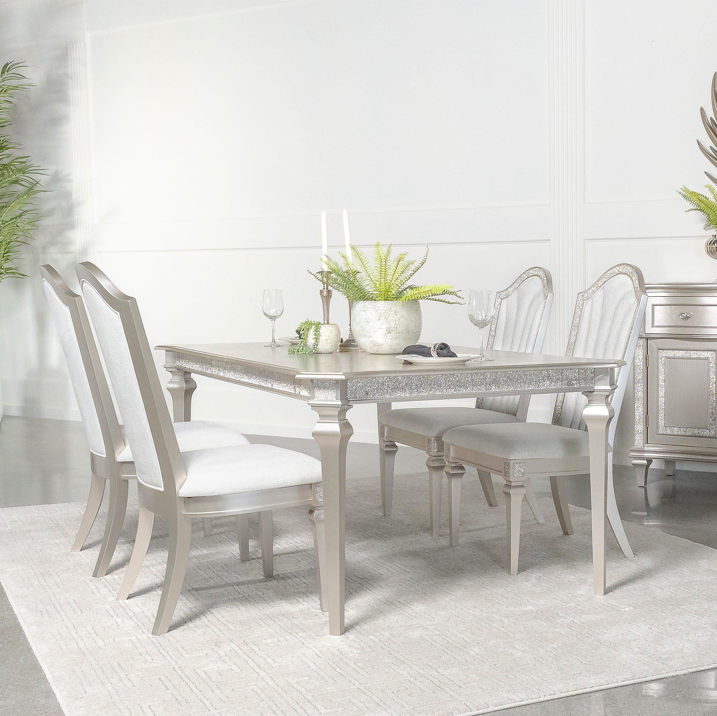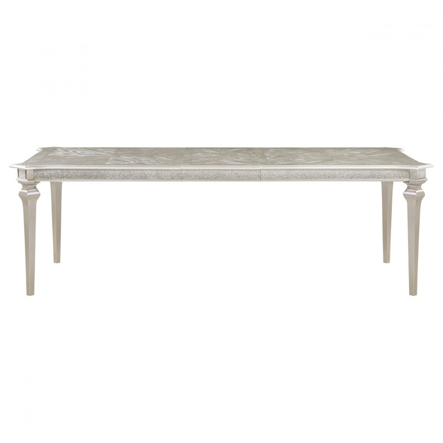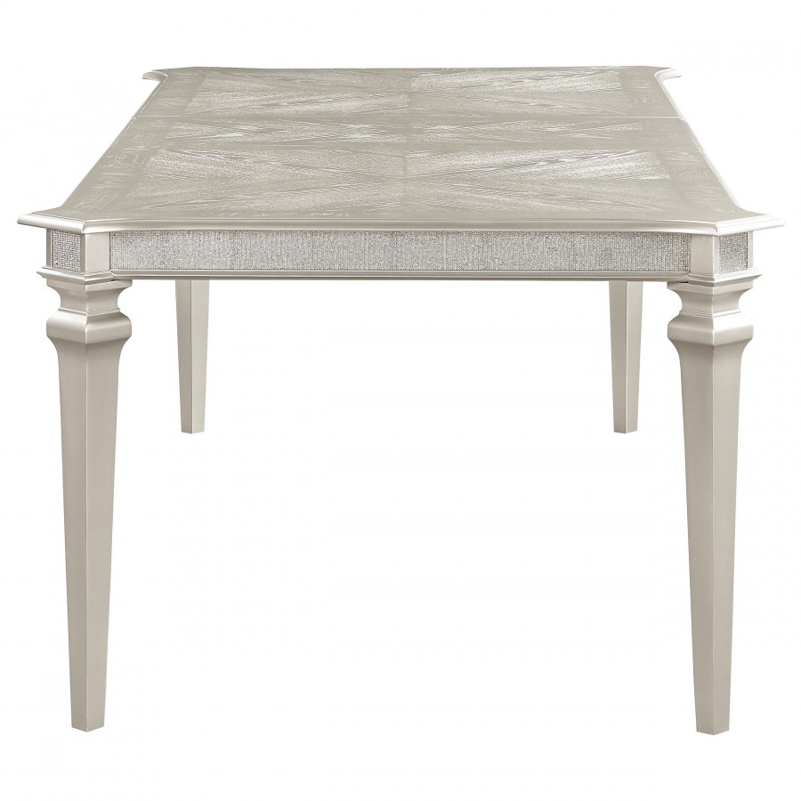 Elevate your dining area with our luxurious Evangeline dining collection. Boasting attention to detail with faux diamond-trim around the table, and chair, this collection includes an 18" removable leaf to comfortably accommodates more guests.
