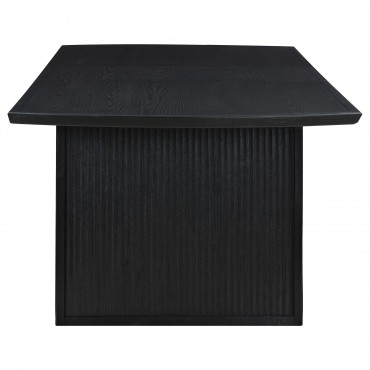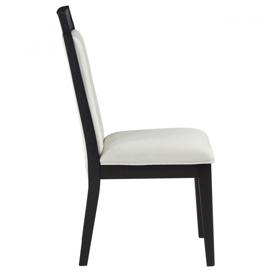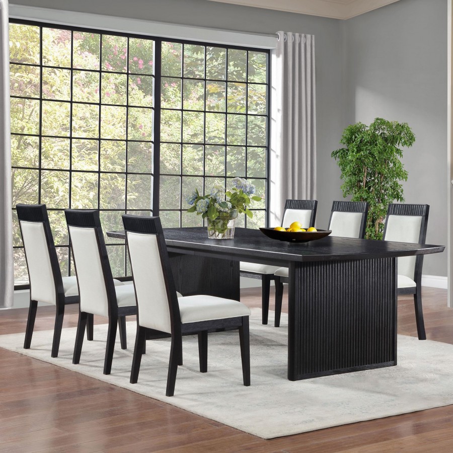 Inspired by trending interior design aesthetics increasingly mixing modern and traditional elements to invent its own style, this seven-piece wood dining set stands out to impress. Crisp, clean style and a contrasting color and finish palette begin the dramatic look of a set suitable for both modern and transitional settings important to your everyday living. Distressed black finish wood construction on all pieces gains attention to a minimalist table design with straight, flat leg sections under a sleek top with linear silhouetting and a dimensional top chamfer curving along its edges. Chairs offer a clean silhouette with black finish wood framing, tapered legs, and ornate notched tops with linear carvings thrown in for extra dimension. Soft ivory fabric upholstery is intriguingly placed on both sides of top cushions and over a padded seat.
