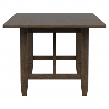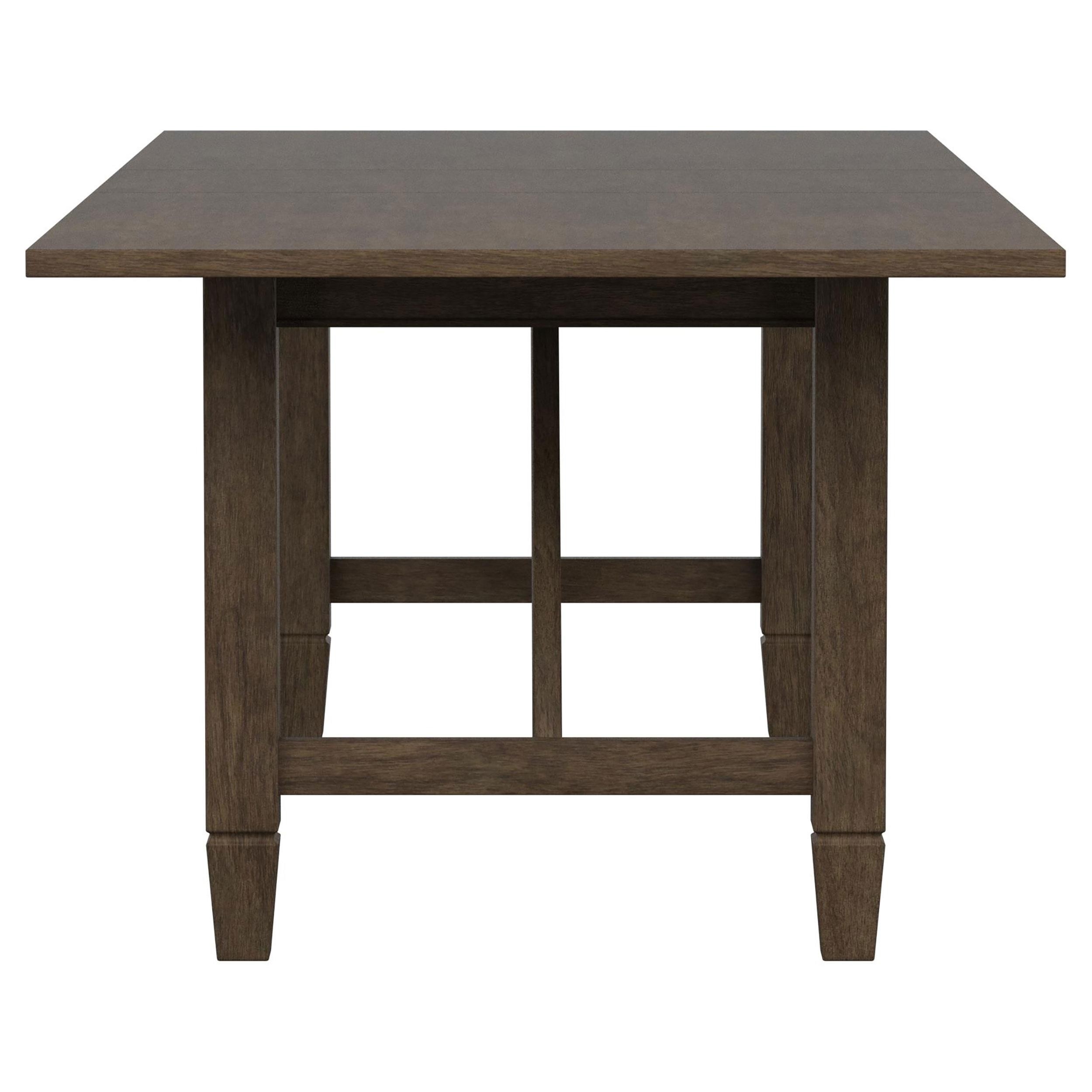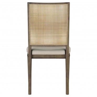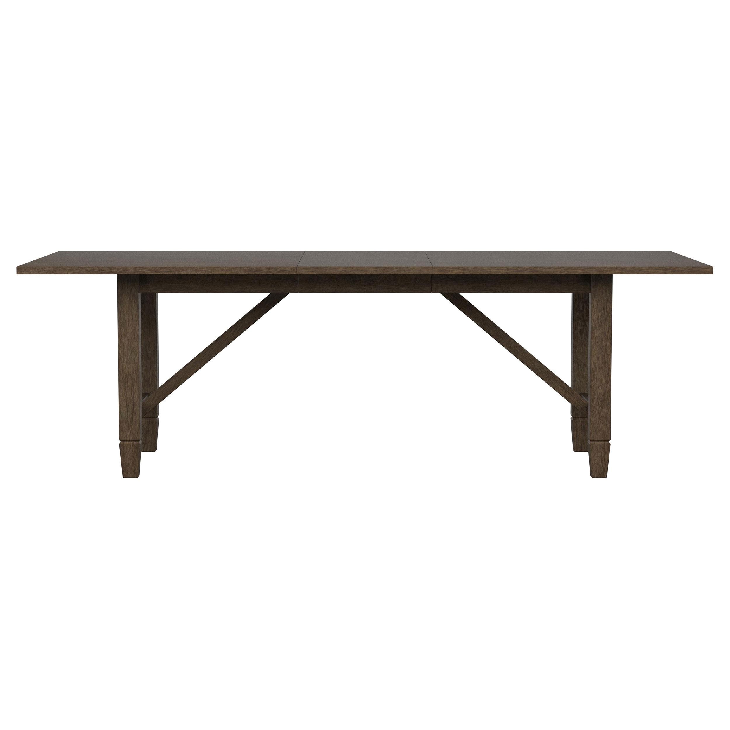 Create a soothing, relaxed ambiance in your welcoming dining room with a transitional five-piece dining set. The set centers on a rectangular table crafted in rubberwoods and graced with a warm, neutral brown finish. Angular support details add trestle-inspired style for a hint of farmhouse flair to the table, which includes an extension leaf for guests. Four side chairs are included, each boasting a matching wooden frame with a plush padded seat in neutral beige upholstery. Rectangular seat backs add rattan, bringing airy appeal and casual character in a kitchen or dining room.