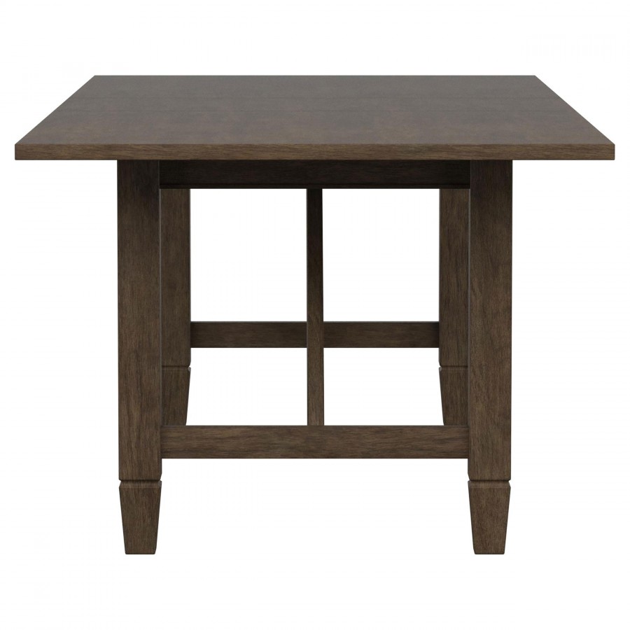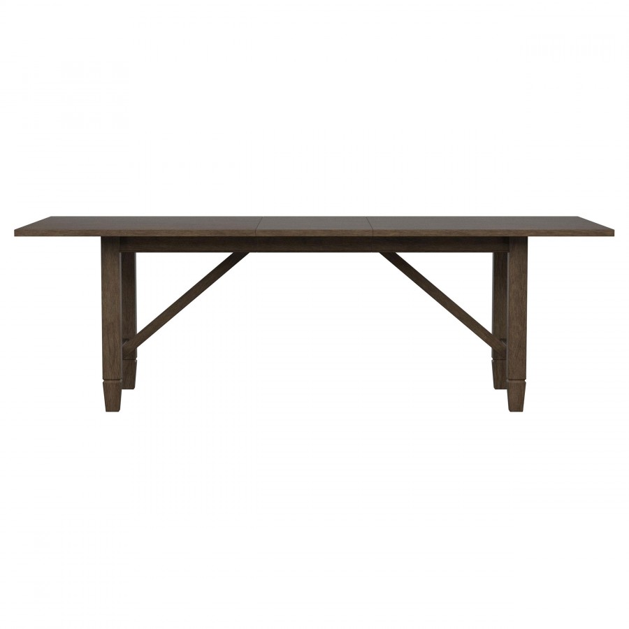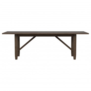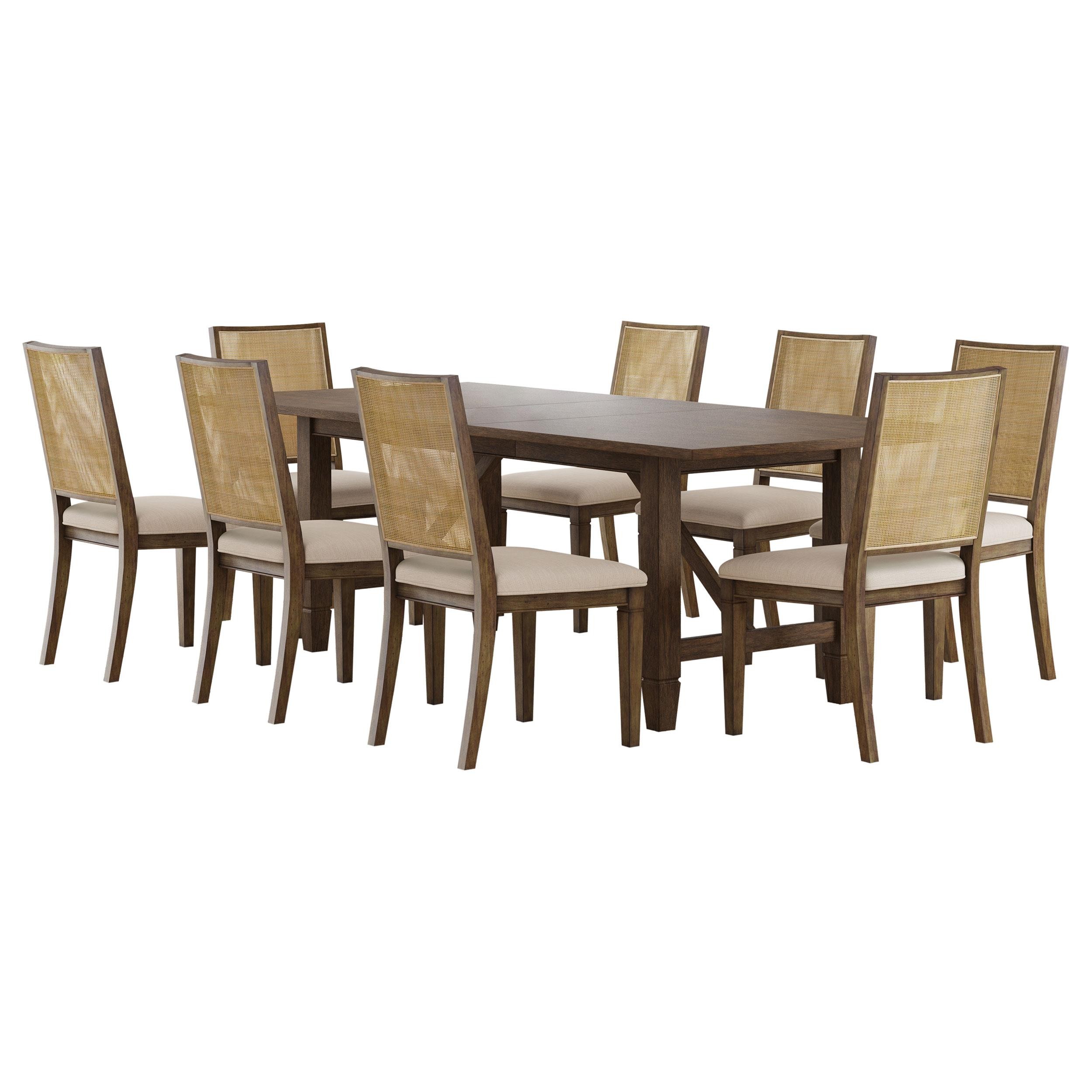 Introduce easy, inviting style with a nine-piece transitional dining set. Creating a perfect spot for family meals or entertaining, the set features a rectangular table crafted in rubberwoods that features an 18-inch extension leaf that offers additional seating for friends and family. A light neutral brown wood finish is perfect for a variety of kitchen and dining room settings, perfectly achieving a warm, inviting ambiance. Chairs are designed with airy rattan backs that add wonderful texture and dimension, while padded seats and beige upholstery are comfortable and stylish. The table adds trestle-inspired angular supports for a touch of compelling character.