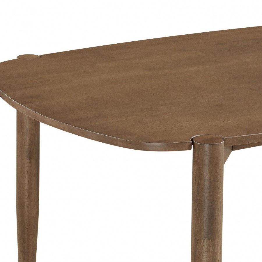 Indulge in a love of Euro-inspired fare that suits your discerning interior design requirements. This modern five-piece dining set is suited to both contemporary and transitional spaces, bridging motifs creating carefree aesthetics. Walnut finish rubberwood construction is sturdy without overly chunky, maintaining the clean lines you like to see. This set features a rectangular table with a straight edge top and rounded corners, as tapered legs are flush mounted as exterior side accents. Retro influence creates four chairs with curved backrests and nicely padded seat cushions upholstered with soft brown fabric.