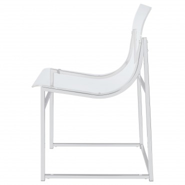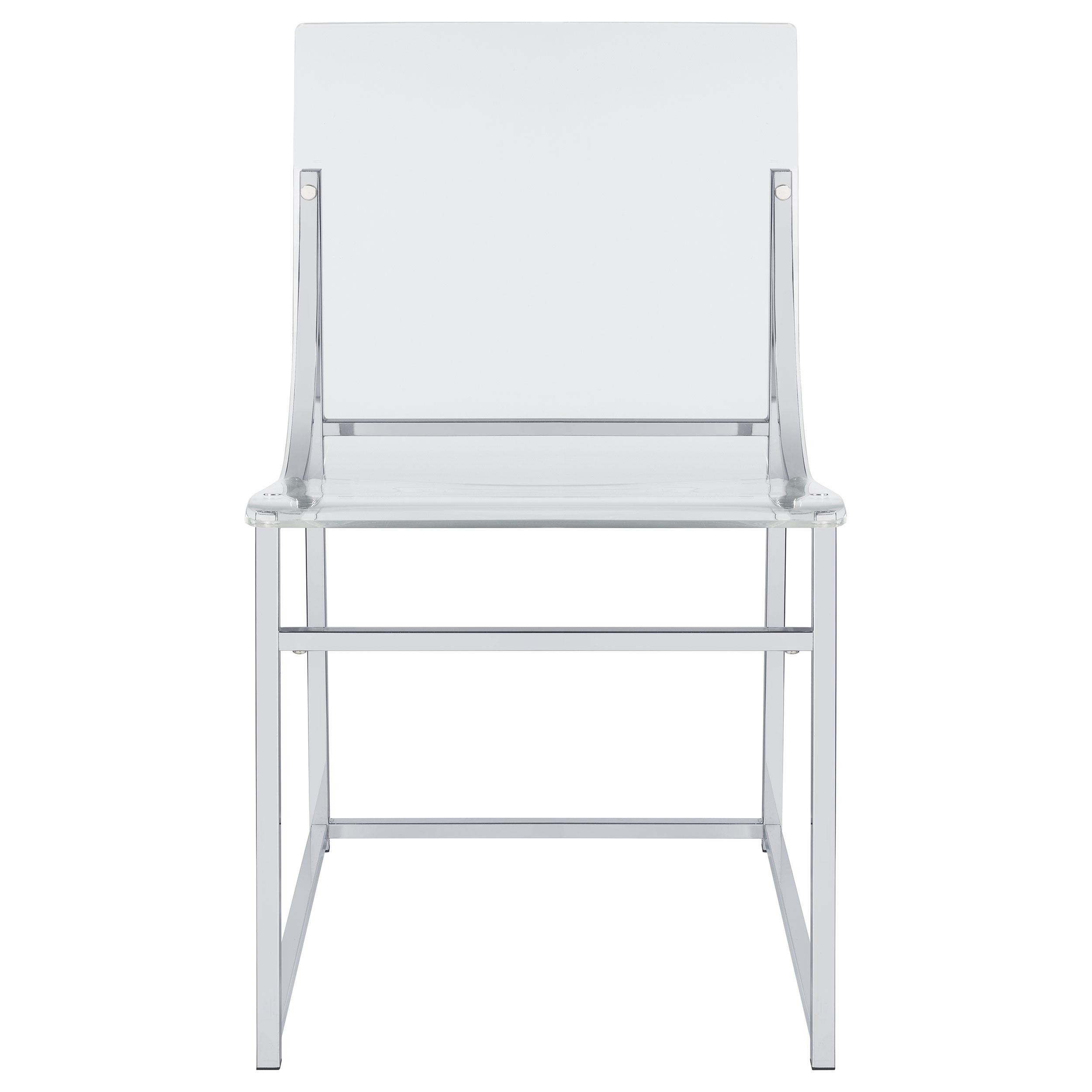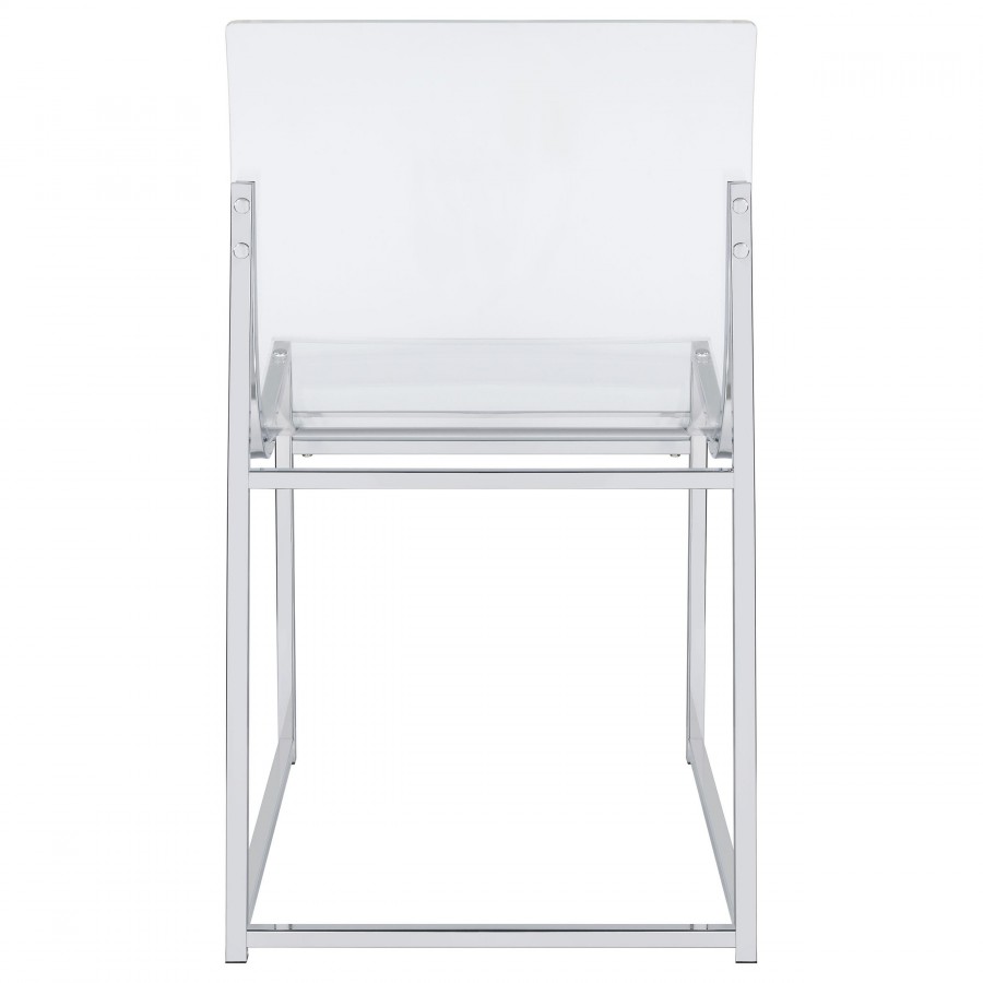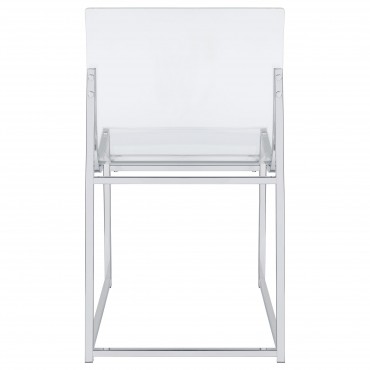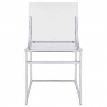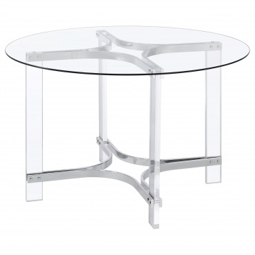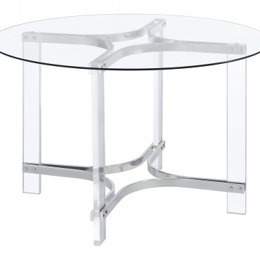 Elevate your dining experience with this chic, contemporary dining set, where modern design meets airy elegance. This set includes a stunning round glass-top table with clear acrylic legs that create a sleek, sculptural profile, complemented by gleaming chrome accents for a touch of sophistication. Four side chairs with clear acrylic seats and backs complete the set, adding a minimalist yet comfortable touch to your space. The sled-inspired chrome bases of the chairs provide stability and a dynamic contrast to the graceful curves of the acrylic, making this set an eye-catching centerpiece for any modern dining room or breakfast nook. Perfectly suited for compact spaces, this set combines style and functionality, offering a light and open feel that effortlessly enhances any decor.
