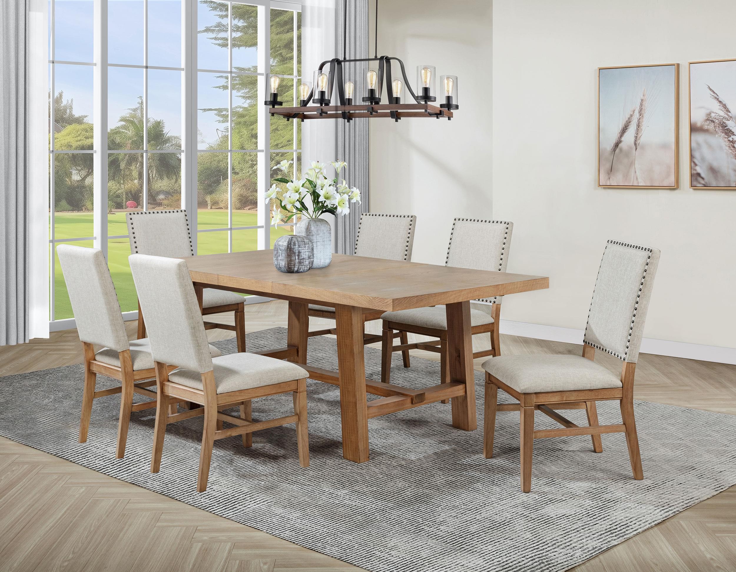 This sophisticated dining set combines timeless style with durability for an inviting dining experience. The extension dining table features a removable 16-inch leaf, expanding from 60 to 76 inches to accommodate both casual meals and formal gatherings. Solid pine, engineered wood, and oak veneer construction ensure lasting strength. Upholstered side chairs with beige fabric and dark bronze nailhead trim provide comfort and elegance. Designed for versatility, this set enhances any dining space with warmth and refinement.