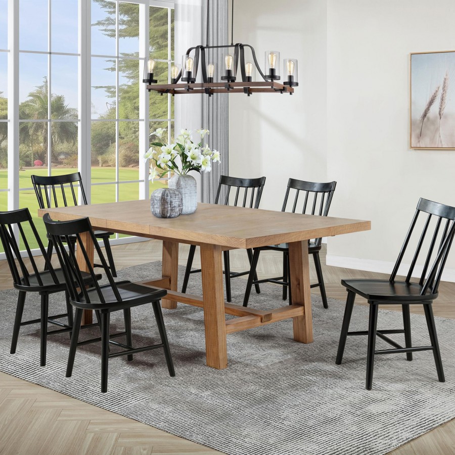 This refined dining set pairs timeless craftsmanship with a modern touch for a stylish and functional space. The extension dining table features a removable 16-inch leaf, expanding from 60 to 76 inches to accommodate various gatherings. Solid pine, engineered wood, and oak veneer construction ensure long-term durability. Complementing the table, Windsor-style dining chairs offer a sleek, contoured design with slender spindles for comfortable support. Blending traditional and contemporary elements, this set enhances any dining room with lasting appeal.