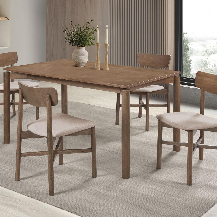 Elevate your dining space with the perfect combination of minimalist style and everyday comfort. This dining set pairs a beautifully crafted rectangular dining table with matching chairs, each constructed with solid wood and finished in a trendy tone cohesive to any room setting. The dining table offers a sturdy, spacious surface for meals, gatherings, or even work-from-home setups. Each chair features a padded foam seat upholstered in tan fabric, providing both style and comfort, while the simple yet elegant design of the set complements a variety of interior styles, from modern to transitional.