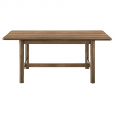 Accentuate the inviting style of your kitchen or dining room with a modern rectangular dining set. It offers fresh, contemporary flair with a walnut wood grain finish paired with beige upholstery on its chairs. The table features a trestle base and round post legs, offering casual ambiance for a welcoming home. Chairs are designed with wooden back and wedge details that add movement and character. Foam seat cushions are upholstered in beige fabric, offering neutral contrast and providing exceptional comfort and support for delicious meals.