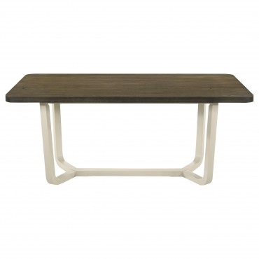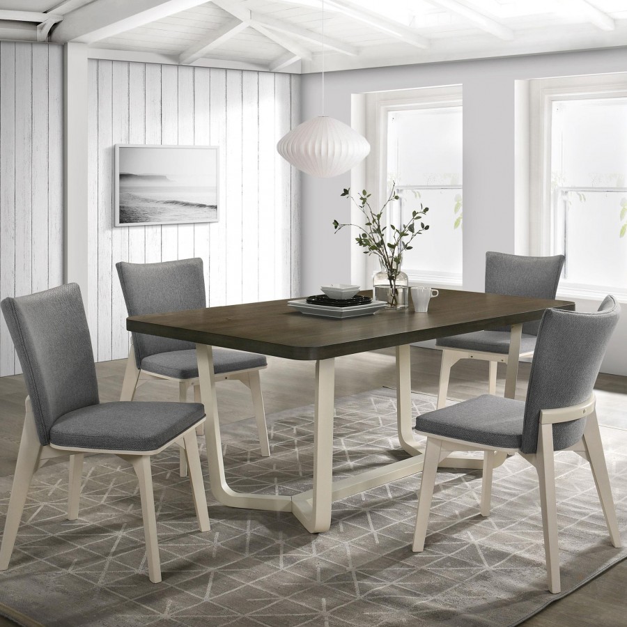 Refresh a family dining space with the cool hues and eye-catching design of this modern dining set. It includes a rectangular table and side chairs, creating an inviting centerpiece in your dining room or eat-in kitchen. The table boasts a two-tone finish with a rich wood grain tabletop complete with rounded corners, and a white finish base with chic angularity. Chairs are plush and comfortable, complete with gray fabric upholstery over plush cushions that create streamlined aesthetics in your space. The tri-tone combination is fresh and inviting, perfect for a welcoming space to catch up with friends and family.