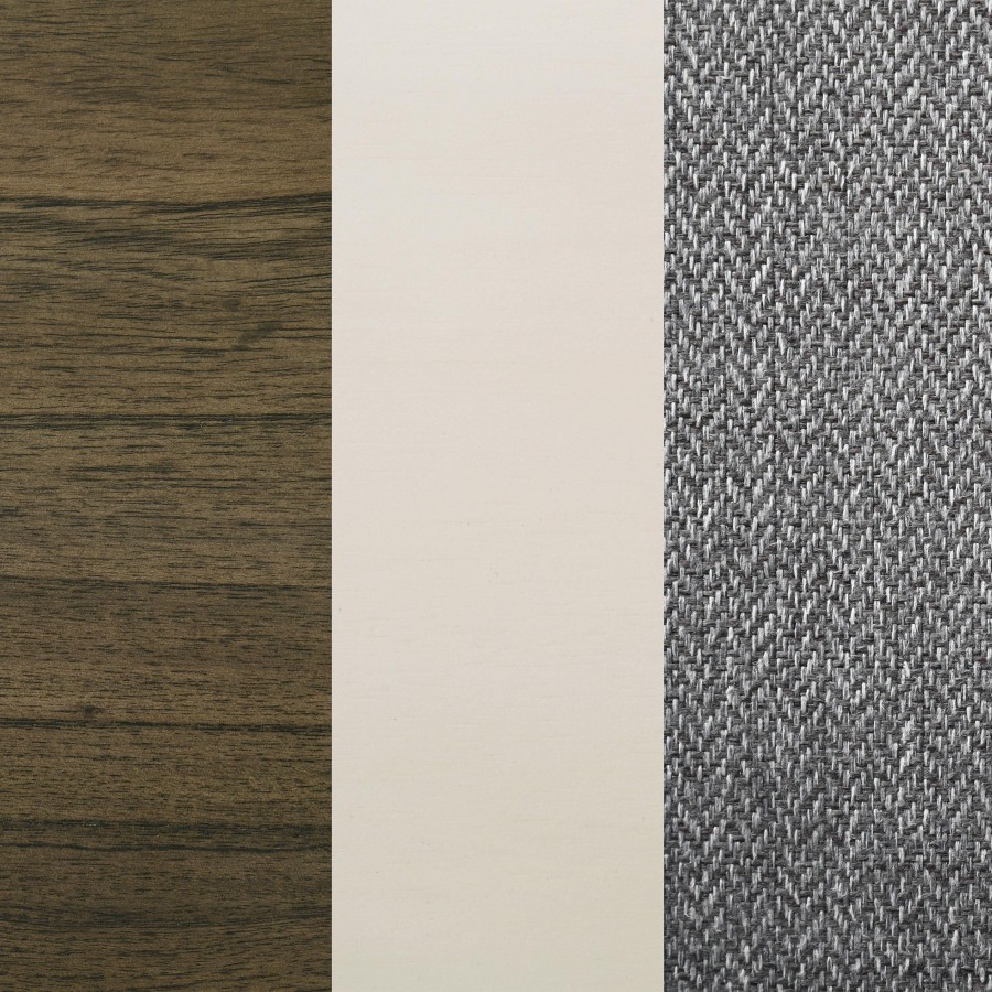 Refresh a family dining space with the cool hues and eye-catching design of this modern dining set. It includes a rectangular table and side chairs, creating an inviting centerpiece in your dining room or eat-in kitchen. The table boasts a two-tone finish with a rich wood grain tabletop complete with rounded corners, and a white finish base with chic angularity. Chairs are plush and comfortable, complete with gray fabric upholstery over plush cushions that create streamlined aesthetics in your space. The tri-tone combination is fresh and inviting, perfect for a welcoming space to catch up with friends and family.