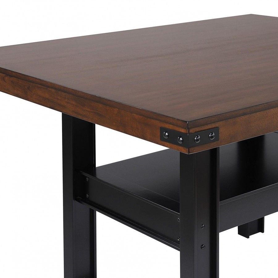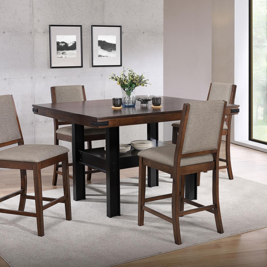 The warmth of a mango oak finish infuses inviting character in a five-piece counter height dining set. Designed with modern industrial charm and character, it's perfect for a farmhouse or casual setting, offering comfortable seating and a multi-functional table. The table shows off a two-tone finish with a mango oak finish tabletop and black base, which includes a shelf perfect for essentials. Strap and bolthead detail decorate the table's edge, while chairs add seating for four. Each counter height chair features a clean-lined profile complete with a foam padded back and seat in beige upholstery for a crisp, neutral complement.