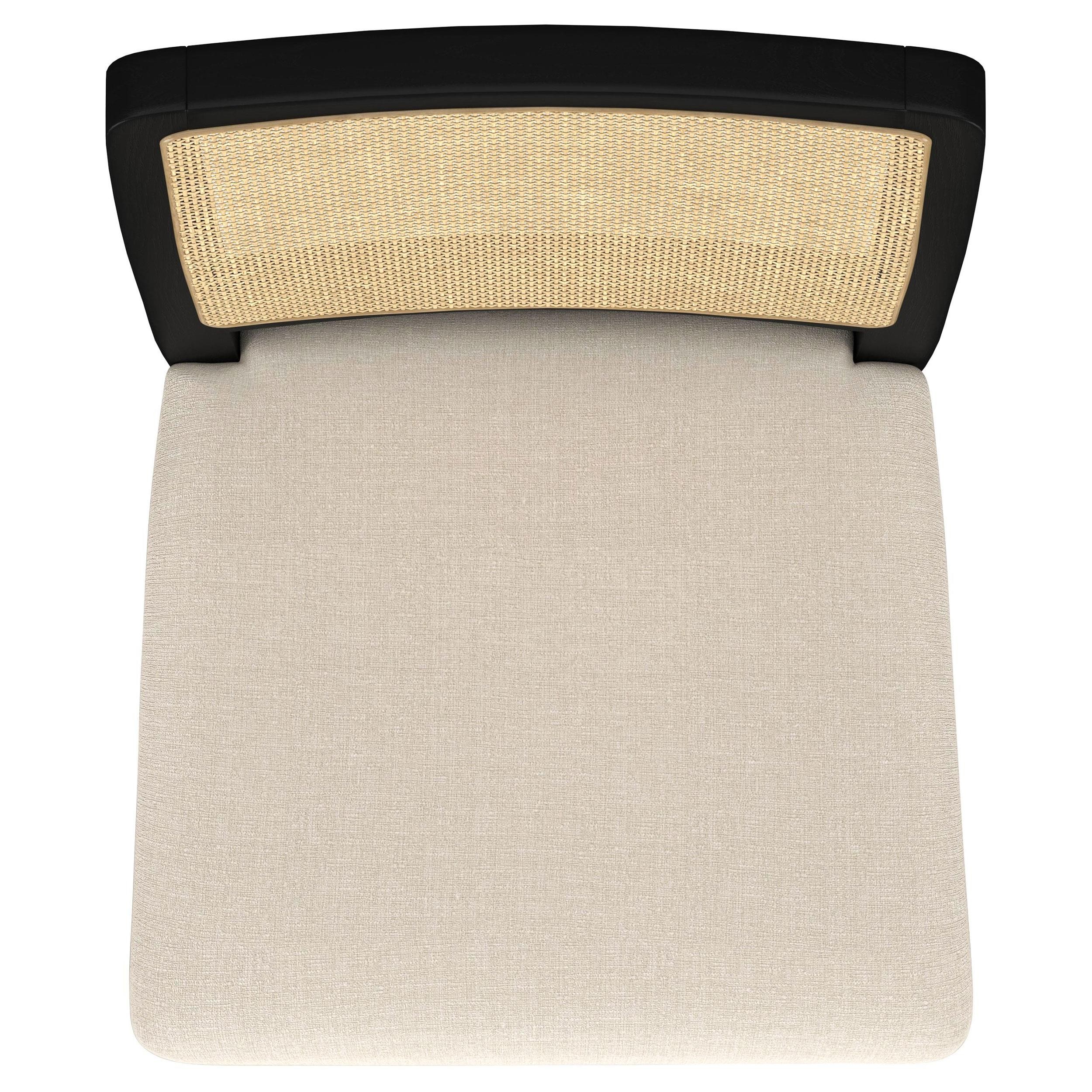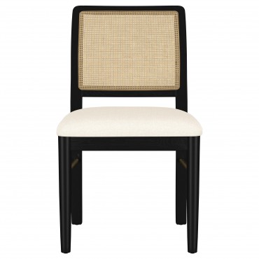 Rustic elegance and tailored design unite in this striking dining set, blending relaxed materials with refined structure. The round table features a sand wash finish over a smooth white ash veneer top, supported by clean cylindrical legs and an arched aged brass stretcher. Coordinating side chairs add contrast with handwoven rattan backs, soft upholstered seats, and sleek metal stretchers. Built from solid rubberwood, engineered wood, and natural textures, this set brings everyday comfort to modern rustic dining.