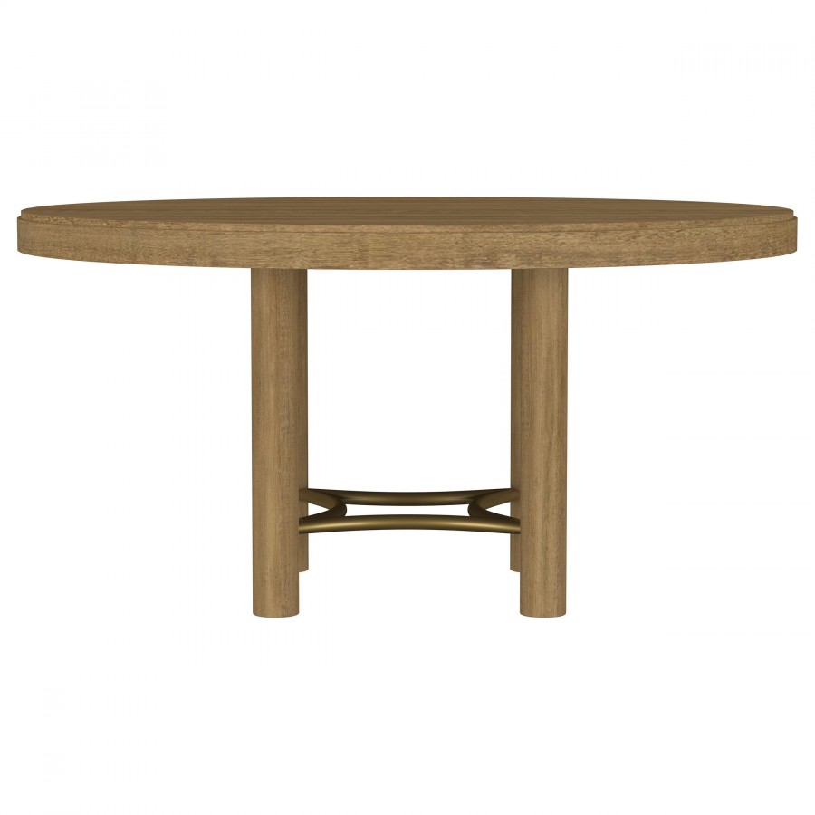 Rustic elegance and tailored design unite in this striking dining set, blending relaxed materials with refined structure. The round table features a sand wash finish over a smooth white ash veneer top, supported by clean cylindrical legs and an arched aged brass stretcher. Coordinating side chairs add contrast with handwoven rattan backs, soft upholstered seats, and sleek metal stretchers. Built from solid rubberwood, engineered wood, and natural textures, this set brings everyday comfort to modern rustic dining.