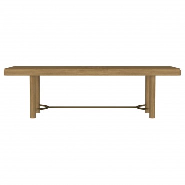 This dining set blends modern craftsmanship with natural textures for a refined yet inviting feel. The dining table features a trestle base with an antique brass-finished metal stretcher bar, adding stability and contrast. Rounded corners soften the rectangular top, while a removable 18-inch leaf allows for flexible seating. The dining chairs feature handwoven cane backrests, solid wood frames, and Pirelli webbed seat cushions upholstered in beige linen-like fabric for lasting comfort and support. A wood grain finish enhances the natural beauty of the materials.