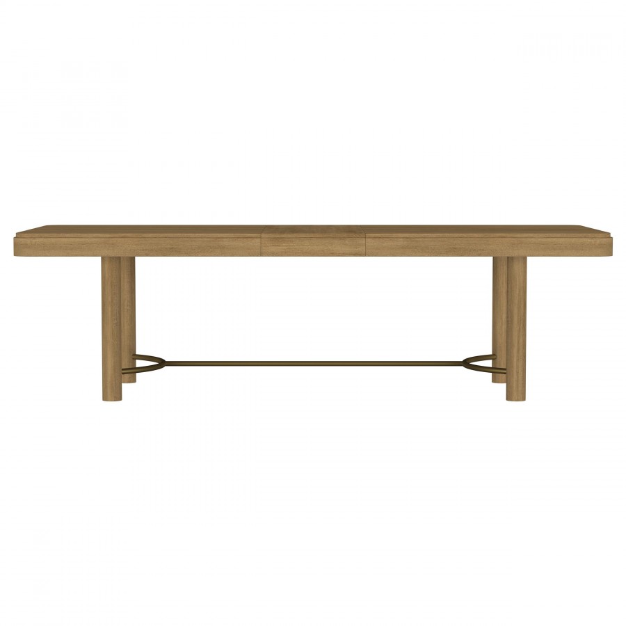 This dining set blends modern craftsmanship with natural textures for a refined yet inviting feel. The dining table features a trestle base with an antique brass-finished metal stretcher bar, adding stability and contrast. Rounded corners soften the rectangular top, while a removable 18-inch leaf allows for flexible seating. The dining chairs feature handwoven cane backrests, solid wood frames, and Pirelli webbed seat cushions upholstered in beige linen-like fabric for lasting comfort and support. A wood grain finish enhances the natural beauty of the materials.