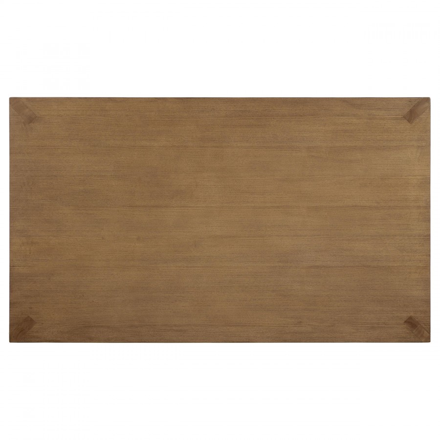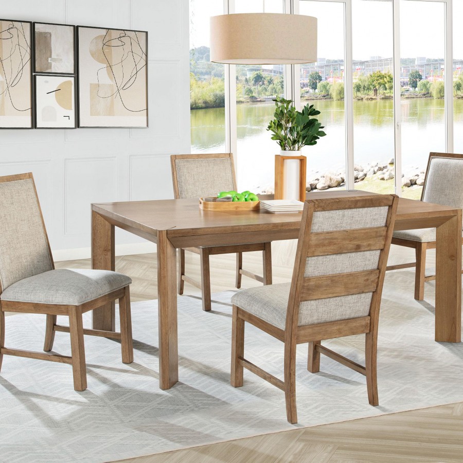 Soothing natural, neutral hues introduce refined style to a modern room set. Offering a soft natural brown wood grain finish over ash veneer and rubberwood, the set delivers an inviting, approachable ambiance to your kitchen or dining room. The table features a spacious rectangular tabletop with angled legs and an angular apron, creating eye-catching flair. Chairs offer soft oatmeal fabric upholstery over plush foam padding, and feature wooden ladder details on chair backs, adding a sense of character and structure. This charming set is a perfect choice for a family dining room.