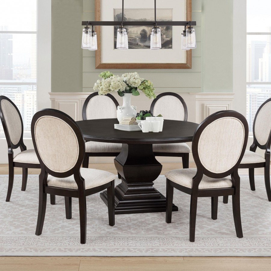 A graceful blend of refinement and comfort, this dining set brings timeless elegance to the heart of your home. The round dining table rests on a sculpted pedestal base, offering a striking silhouette in a rich dark cocoa finish. Matching oval back chairs provide soft cream upholstery with welt-trimmed details, combining plush seating with classical charm. Crafted from rubberwood, engineered wood, and veneer, this set is built for enduring strength and everyday beauty.