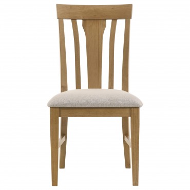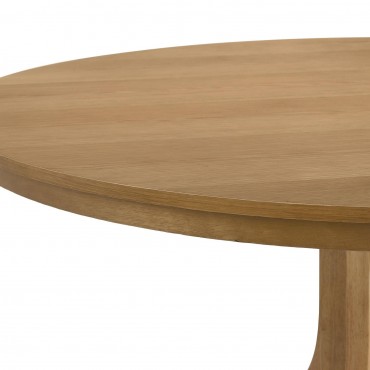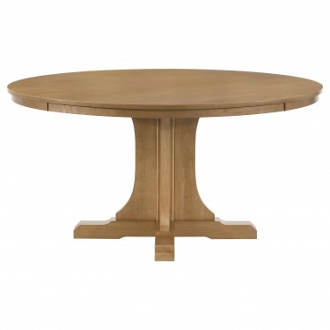 Gather around a dining set that evokes comfort, tradition, and effortless beauty. The round pedestal table anchors the space with a graceful silhouette and natural light brown finish that reveals the rich character of white oak veneer. Slat-back chairs with gently contoured frames and softly padded light tan seats invite relaxed conversation and lingering meals. Thoughtfully crafted for both charm and everyday use, this set brings enduring warmth to any dining room.