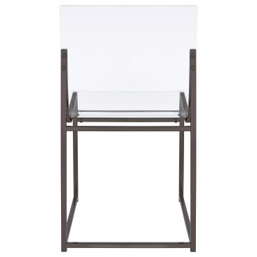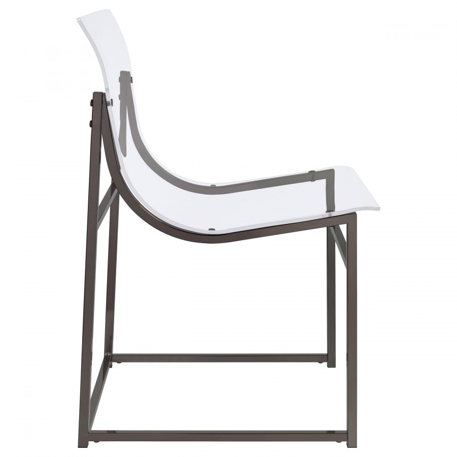 Elevate your dining experience with this striking five-piece dining set, blending contemporary design with modern elegance. The centerpiece is a round dining table, featuring a sleek mirror glass tabletop and supported by angular, open frame legs that add a touch of geometric flair. Complementing the table are four avant-garde dining chairs that redefine modern style with their clear acrylic backs and minimalist metal frames. The black nickel finish of the table and chairs enhances the set's sophisticated appeal, making it perfect for both casual meals and elegant entertaining. Whether hosting dinner parties or enjoying a quiet meal, this dining set transforms your space into a chic dining oasis.