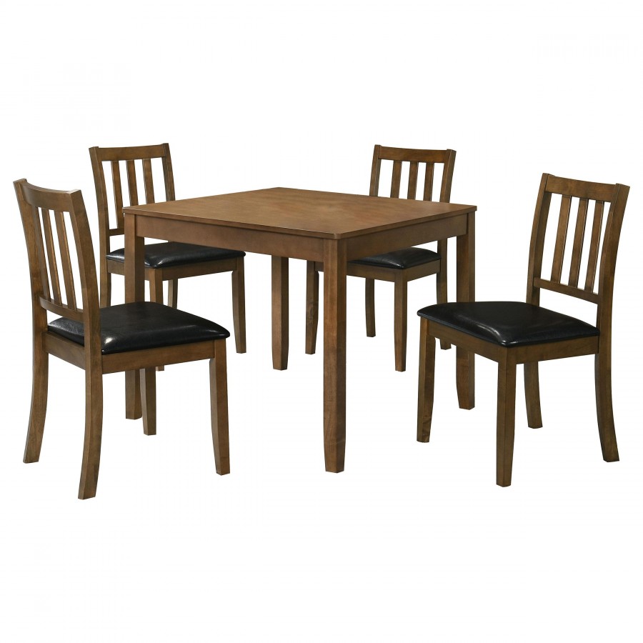 Perfectly sized for a breakfast nook or compact dining room, this contemporary five-piece dining set offers inviting style and a compact profile. The set centers on a square dining table crafted of wood with okume veneer in a stylish, neutral finish. Four chairs complete the set, offering comfort with plush foam padded seats and black faux leather upholstery. Open slatted backs bring an airy touch while maintaining the classic look of this understated set. This set seats four comfortably and looks great with table linens that add a bit of personality.