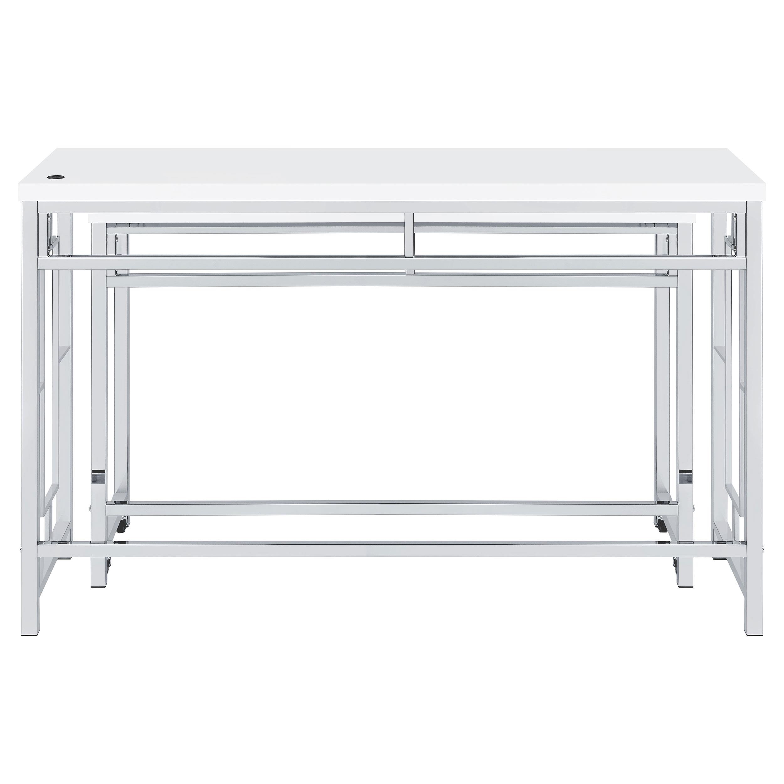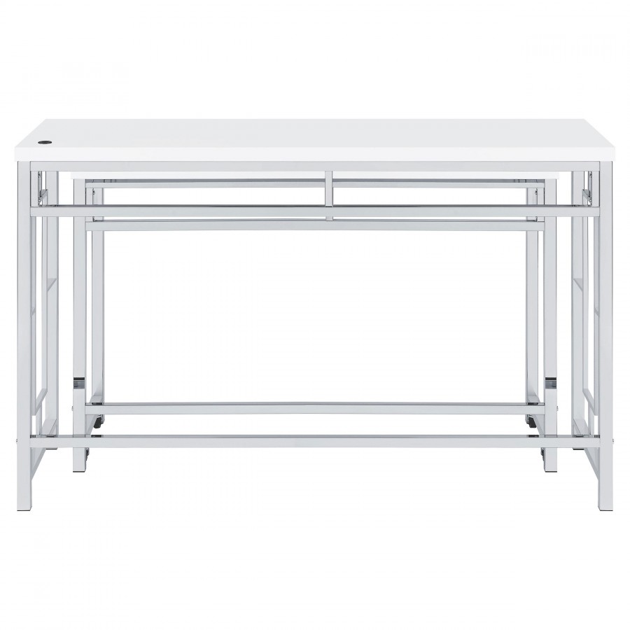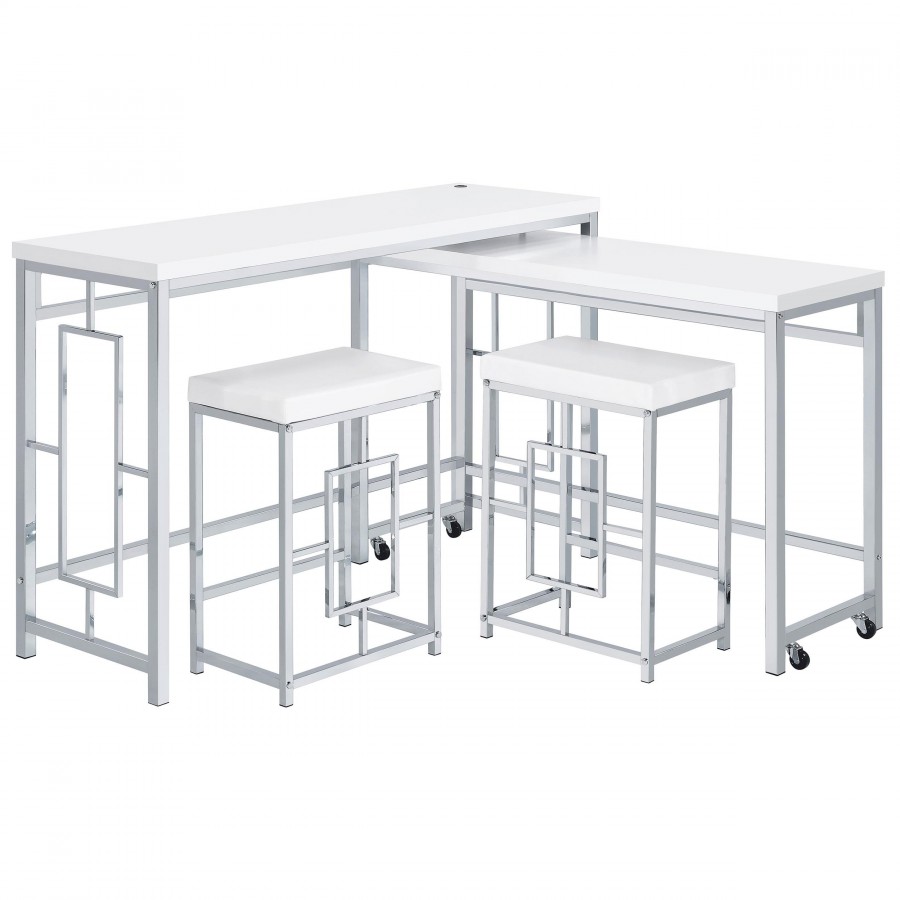 You'll fall in love with the versatility and impeccable styling of a contemporary four-piece counter height dining table set that includes two nesting tables and two backless stools. Whether you're dining or working from home, the set is designed to impress, with a larger table and a smaller table on wheels that tucks underneath, creates a waterfall effect, or can be positioned in an L-shape for working from home. Its crisp white and silver finish combination highlights artistic design. The set is complete with open sides and stool bases accentuated with floating frames to bring Deco character. The large tabletop is equipped with a USB port perfect for your phone.