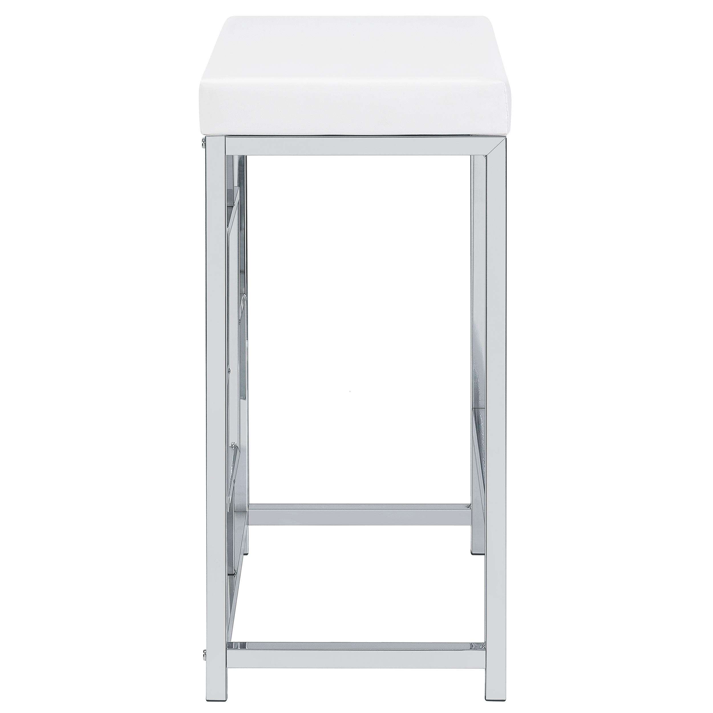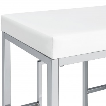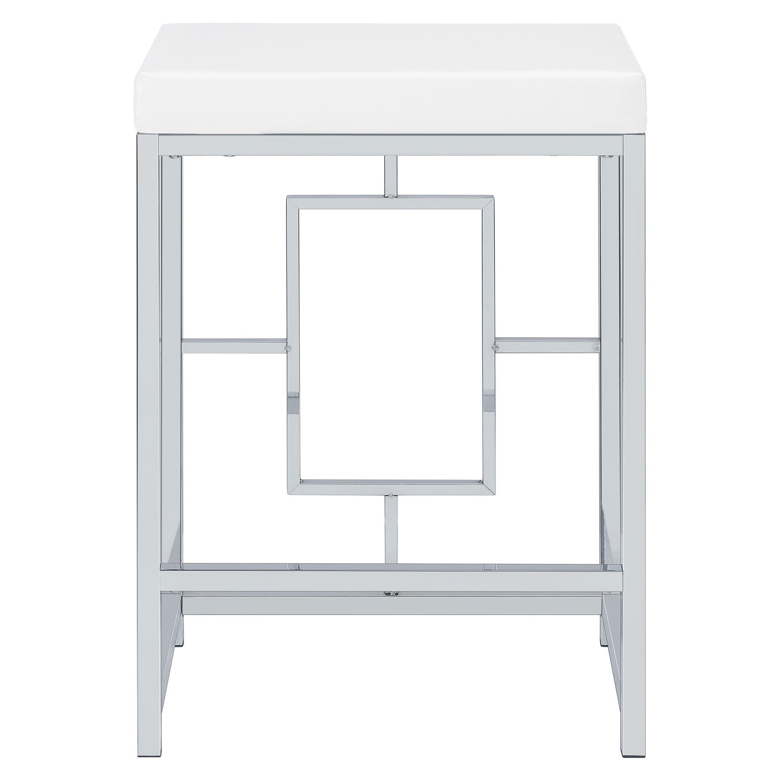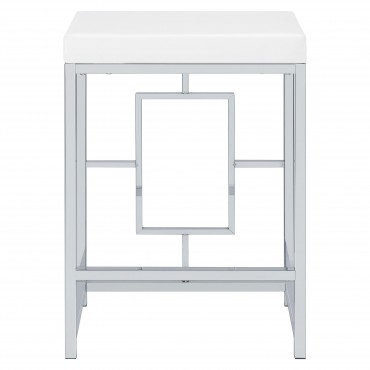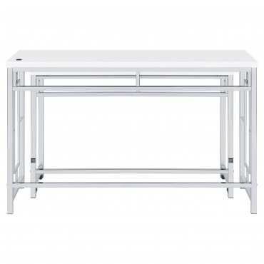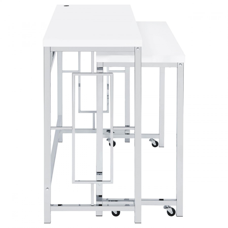 You'll fall in love with the versatility and impeccable styling of a contemporary four-piece counter height dining table set that includes two nesting tables and two backless stools. Whether you're dining or working from home, the set is designed to impress, with a larger table and a smaller table on wheels that tucks underneath, creates a waterfall effect, or can be positioned in an L-shape for working from home. Its crisp white and silver finish combination highlights artistic design. The set is complete with open sides and stool bases accentuated with floating frames to bring Deco character. The large tabletop is equipped with a USB port perfect for your phone.
