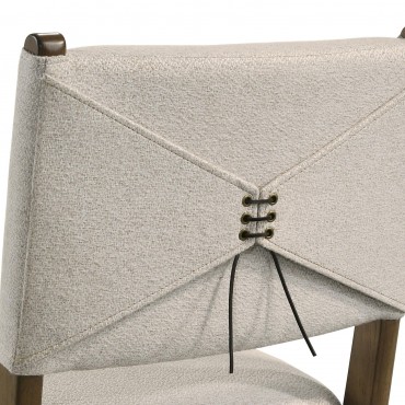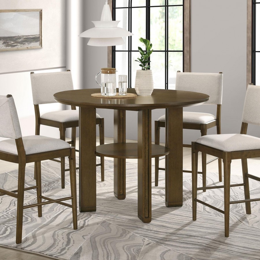 This counter-height dining set blends transitional style with practical design, creating a warm and inviting space for casual dining. The set includes a round counter-height table with a rich brown finish, angular legs, and an open lower shelf for added functionality. Complementing the table are matching counter-height chairs upholstered in light tan fabric with foam-padded seats. Each chair features a wrapped backrest with unique brown tie accents for a sophisticated touch. Crafted from durable rubberwood, engineered wood, and fabric, this set is perfect for everyday dining or entertaining.