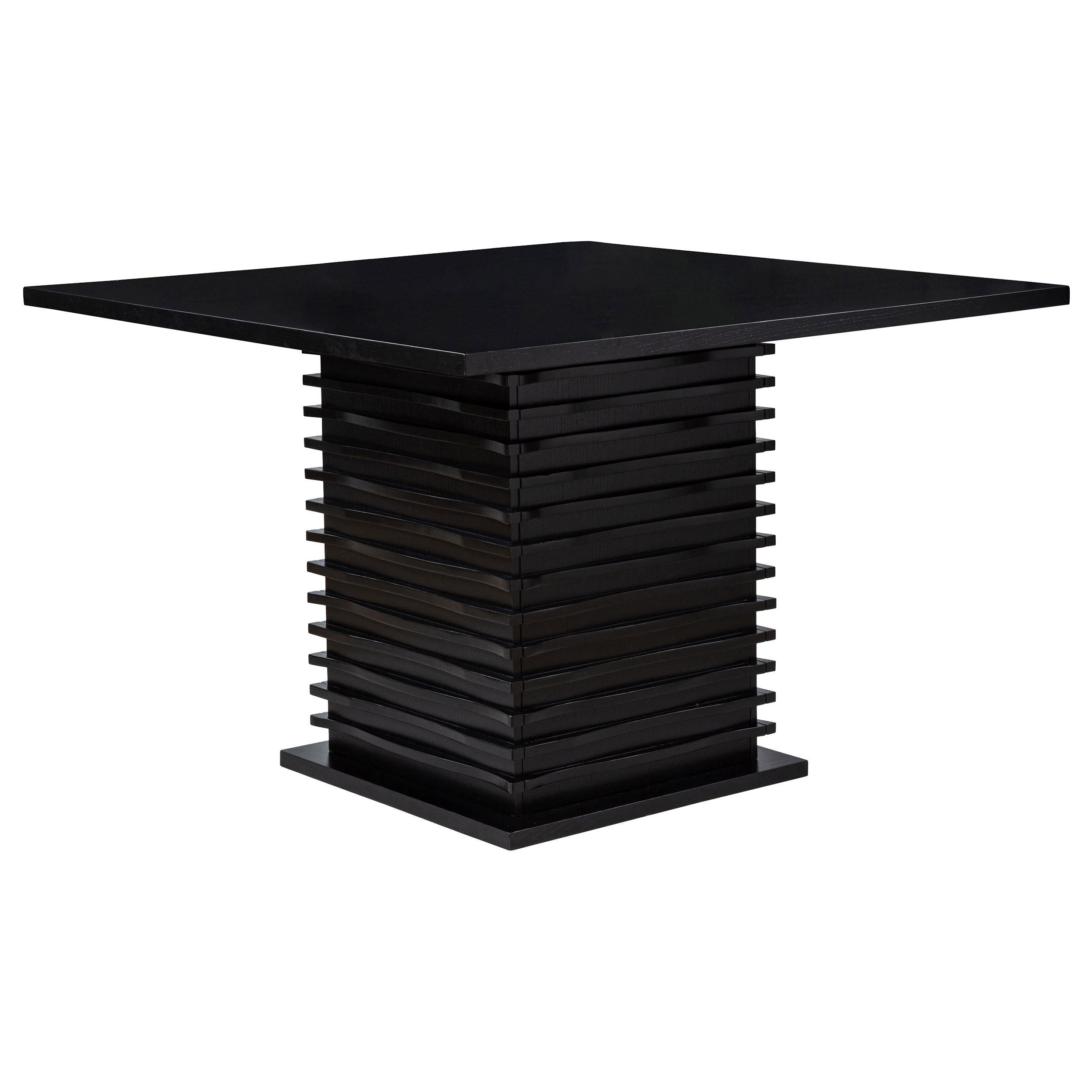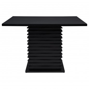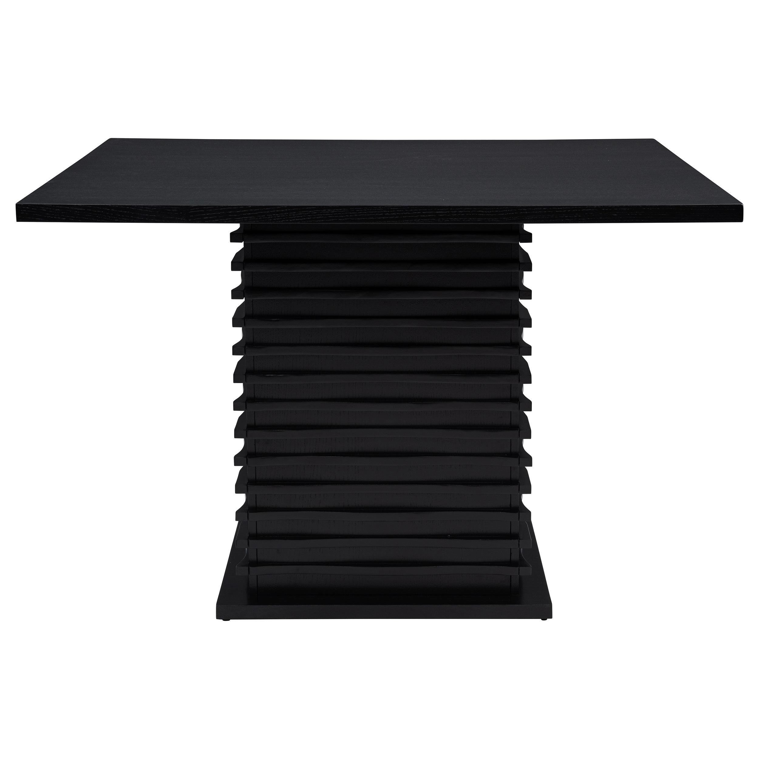 Express modern simplicity with the neutral tones from this five-piece dining set. Constructed of ash veneers, the table and four side chairs feature a rich black finish. Sleek and clean, the open base of the chairs are complete with built-in foot rests and a softly upholstered seat and back. Go all-in on a contemporary casual dining room theme, or add a sophisticated feel to a laid-back entertainment room. The geometric base is elevated with a subtle wave design to enhance visual intrigue.