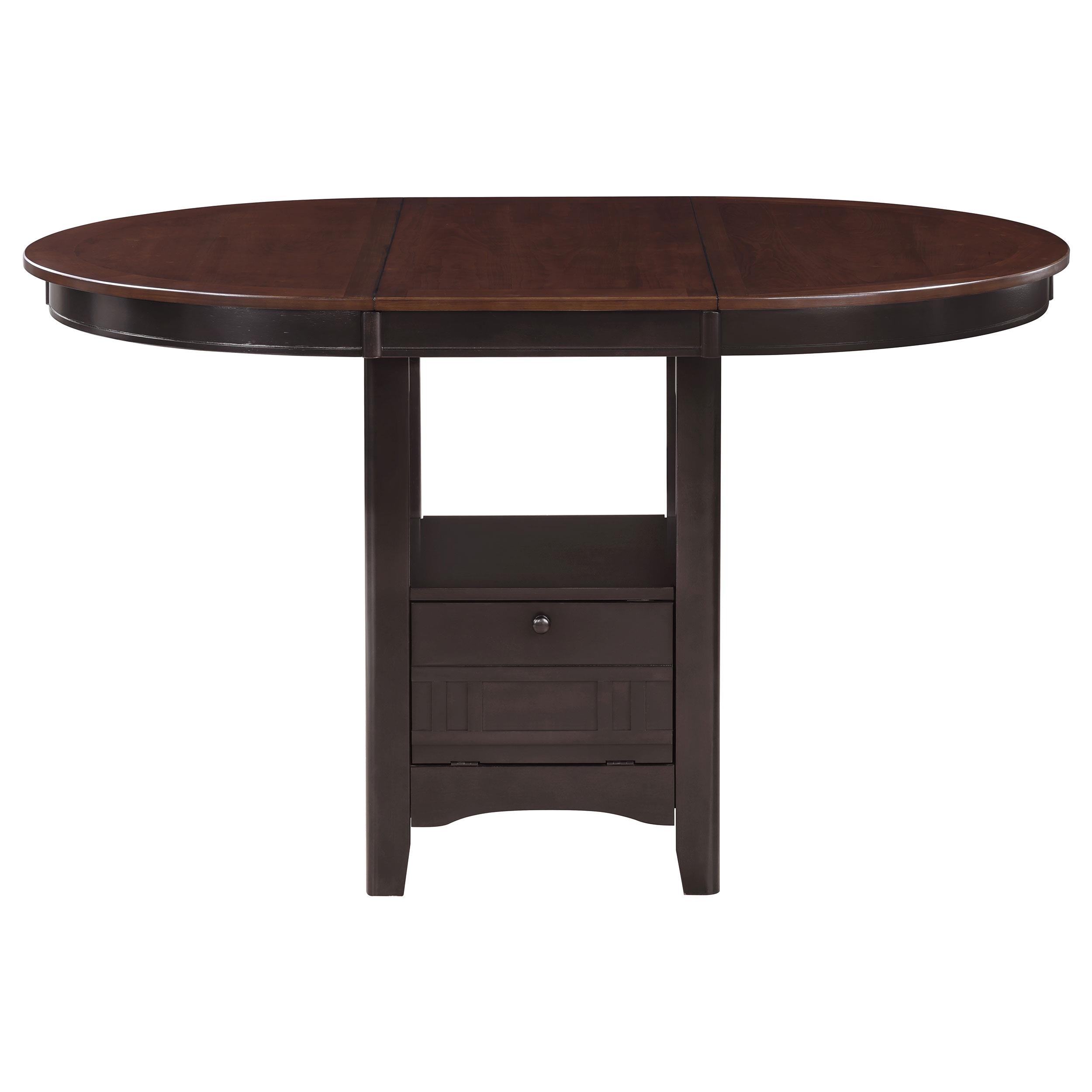 Create visual interest in a small space with this five-piece dining set. Light chestnut and espresso hues on the counter height table creates a warm two-tone effect. Welcome more family and friends with the built-in leaf. Store dinnerware in the built-in storage unit on the base of the counter height table to accommodate guests easily. The smooth legs of the table and four stools invite an open feel into a modern entertainment room.