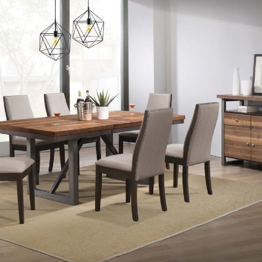 This dining set blends clean lines, natural textures, and everyday functionality for a timeless look. Crafted from solid rubberwood with a warm natural walnut finish, the rectangular dining table features a sappy walnut veneer top and an 18-inch removable extension leaf for added seating. Ergonomically contoured side chairs include padded seats and backs upholstered in soft, durable fabric. With its harmonious balance of simplicity and warmth, this set enhances both casual and formal dining spaces.