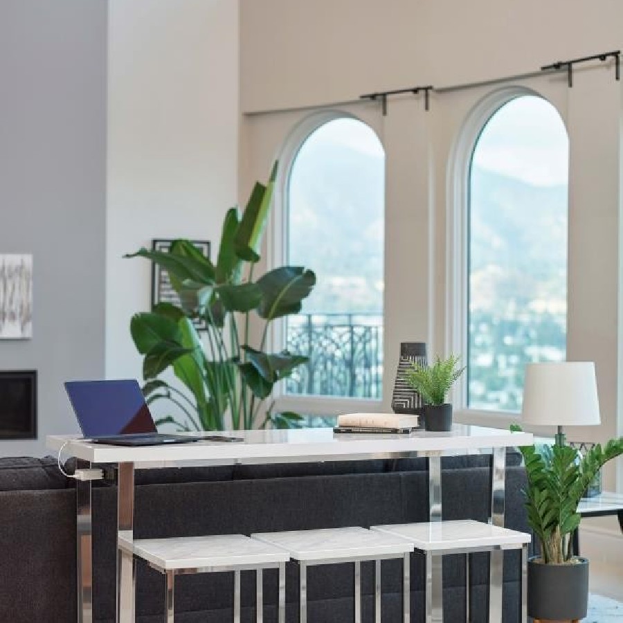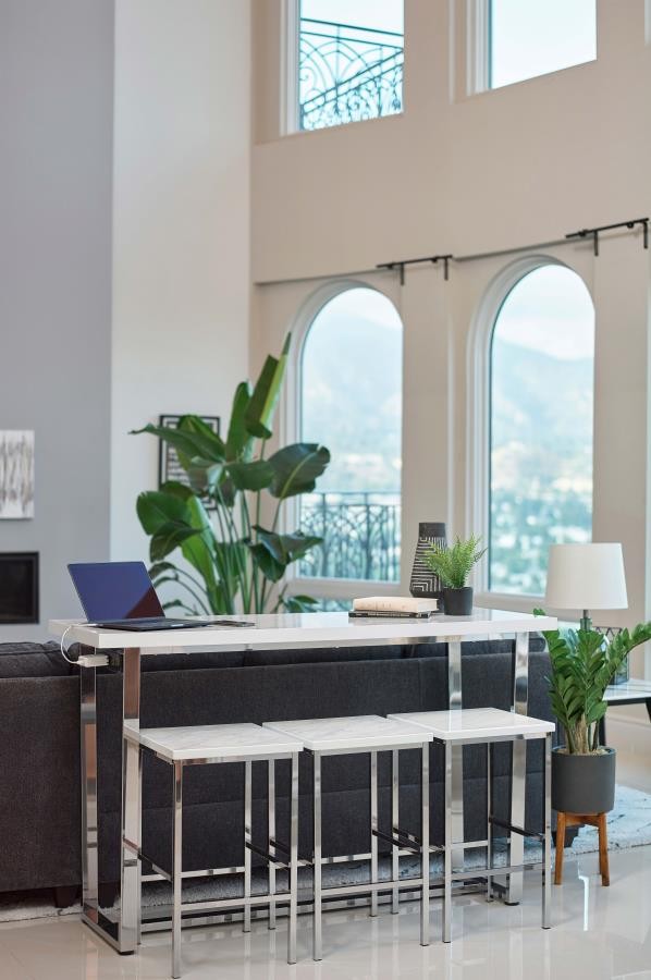 Stylish and versatile, this counter height table set exudes modern elegance. From kitchens to living rooms to rec rooms and more, it's perfect for adding extra seating and table space to any room in your home. The table is crafted with a scratch-resistant surface made from beautiful, white faux marble. The sleek, angular frames are crafted of metal in a gleaming chrome finish for a gorgeous touch of polish. This stunning set comes with one table and three stools to instantly complete your space.