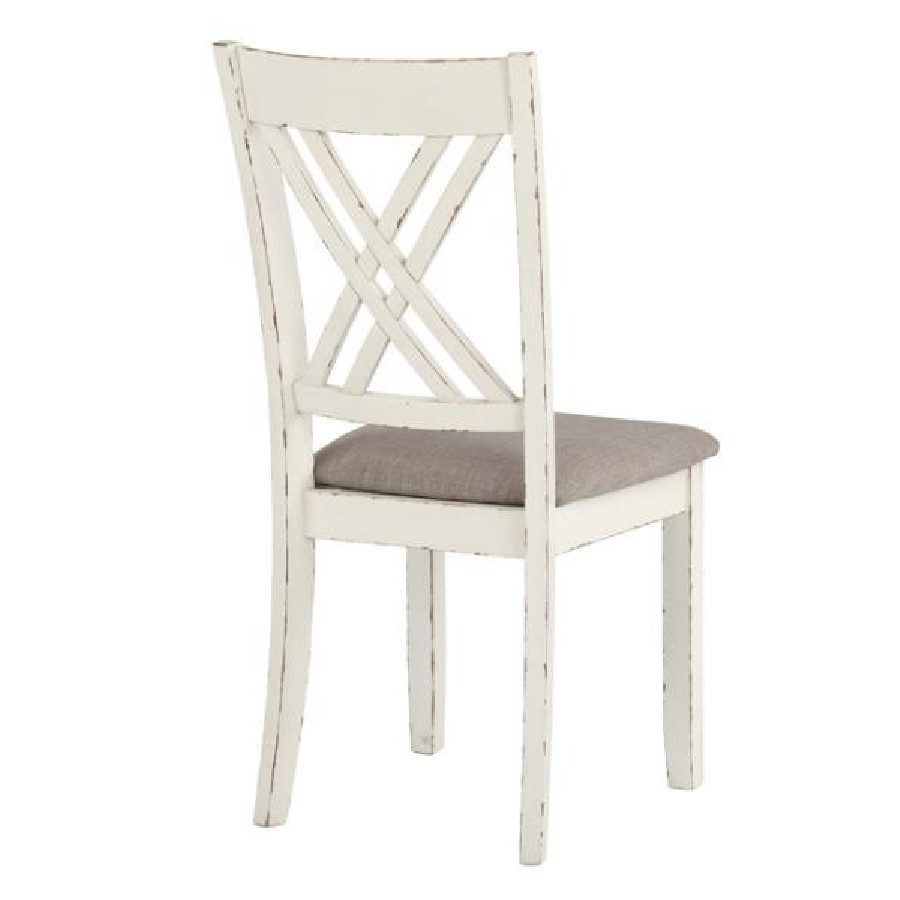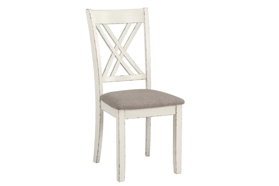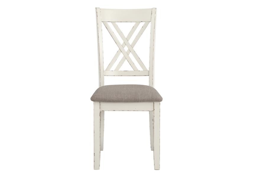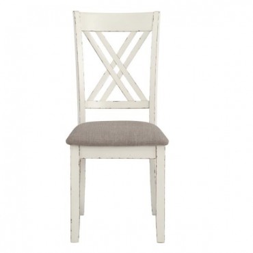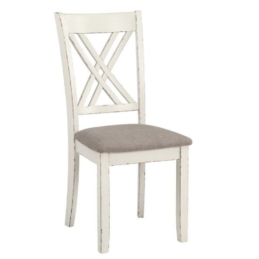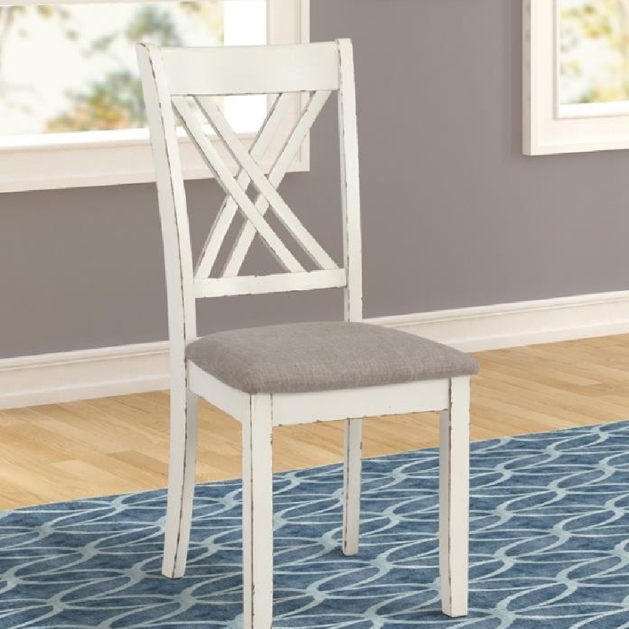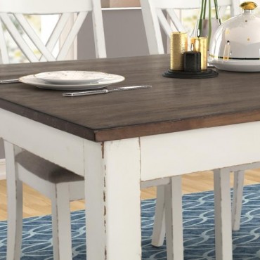 Complete your modern farmhouse dining room with this seven-piece dining set. Complete with one dining table and six side chairs, it offers a matching vintage white finish that lends a country charm. The spacious, rectangular dining table also features a chestnut colored, sandblasted wood tabletop with a dry brushed weathered finish. Each of the six chairs have a sturdy solid wood frame and flared backrests with open double-cross designs. Rest comfortably on their cushioned seats, wrapped in a high performance fabric in a grey hue that complements numerous color palettes.