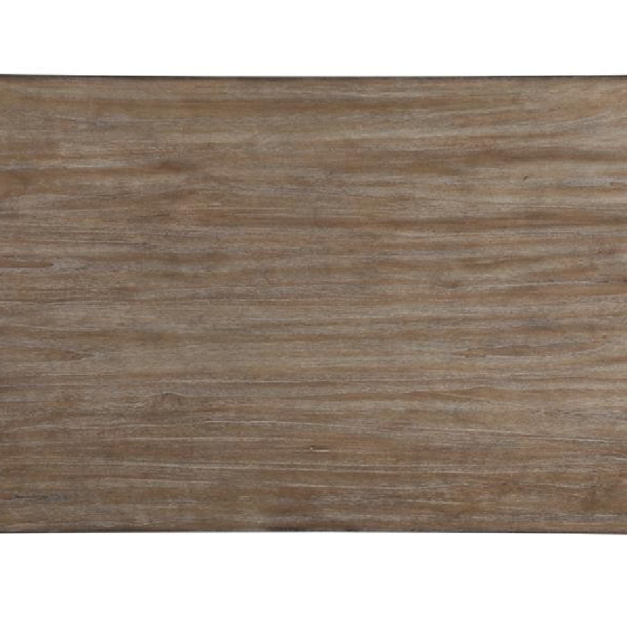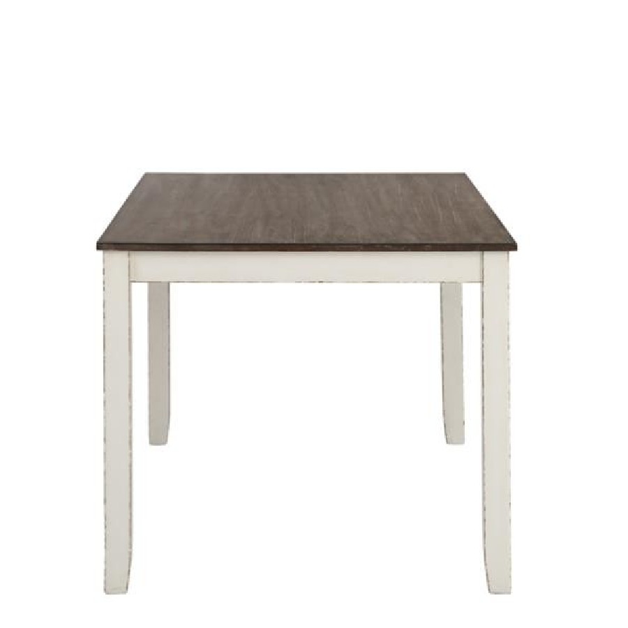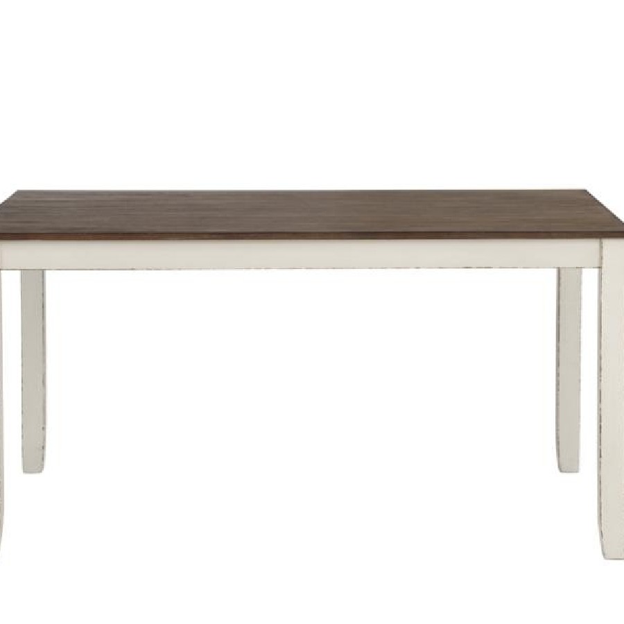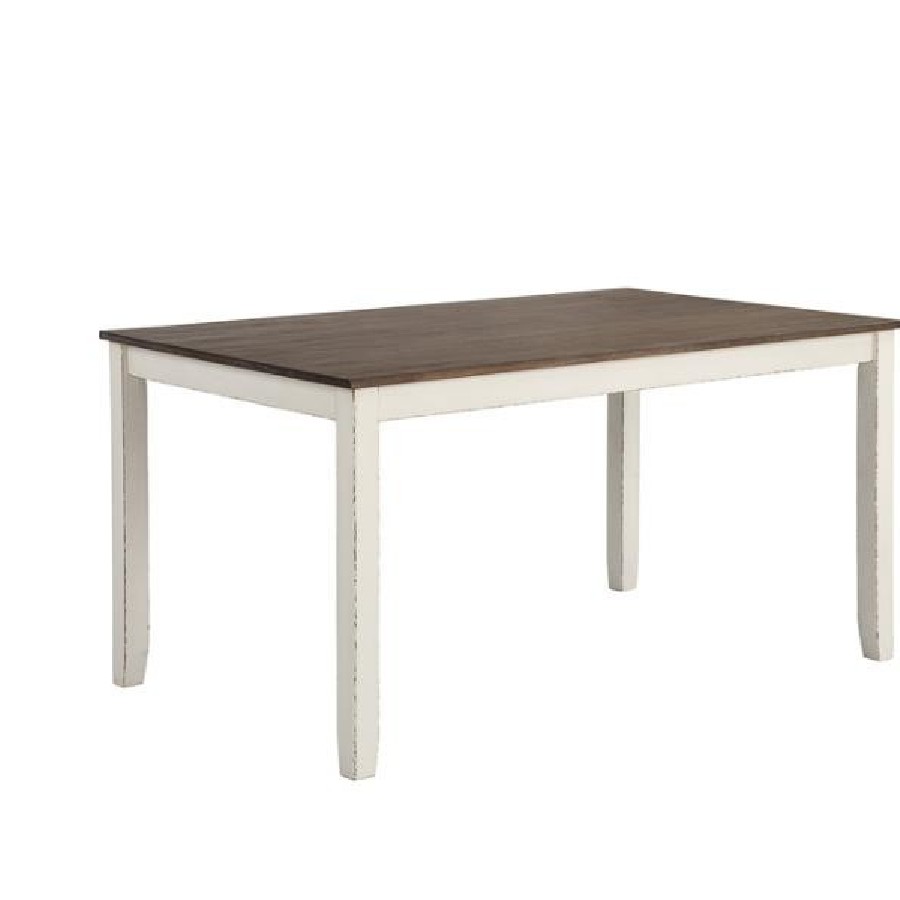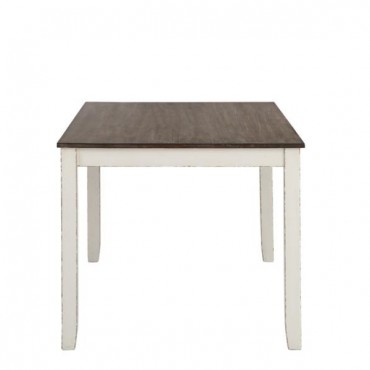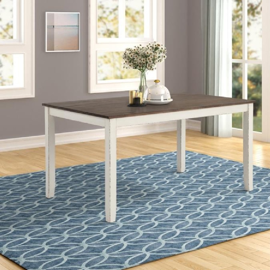 Complete your modern farmhouse dining room with this seven-piece dining set. Complete with one dining table and six side chairs, it offers a matching vintage white finish that lends a country charm. The spacious, rectangular dining table also features a chestnut colored, sandblasted wood tabletop with a dry brushed weathered finish. Each of the six chairs have a sturdy solid wood frame and flared backrests with open double-cross designs. Rest comfortably on their cushioned seats, wrapped in a high performance fabric in a grey hue that complements numerous color palettes.