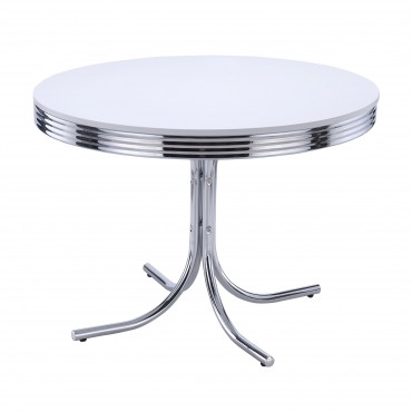 Travel back in time to an easy era where soda shoppes served as social centers. This five-piece dining set features a classic round dining table with a metal ellipse edge profile and shiny top. A decadent flared metal base is open and airy, matching the design of coordinating chairs. Fabric upholstery covers thick seat cushions and slender backs, with piping details creating a bit of dimensionality. Make this dining set part of an overall design scheme that fits your unique style.