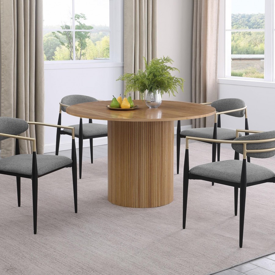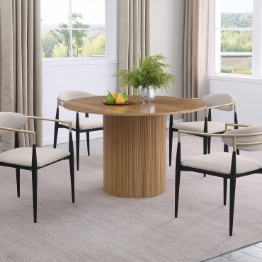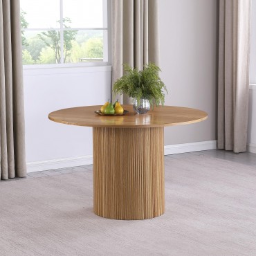 Revamp your kitchen or dining room with a stylish, light brown dining table. This modern round dining table, made from wood with an ash veneer in a natural finish, is a warm, unifying choice for a contemporary dining space. The round tabletop features a sleek and modern silhouette, offering a simple, clean look that is both comfortable and inviting. The table stands on an eye-catching fluted base, a round post pedestal with vertical ribbing that adds a decorative touch without overwhelming. The wood grain details on the tabletop offer an inviting organic flair, adding visual interest to the overall design. This table comfortably seats 4 people, making it perfect for intimate gatherings or family dinners.