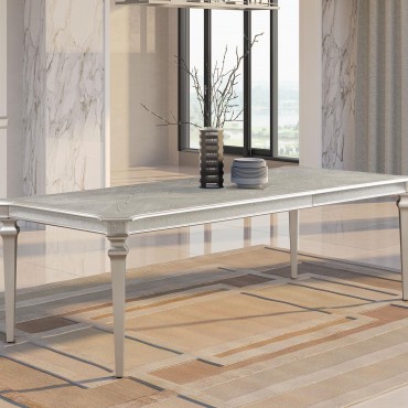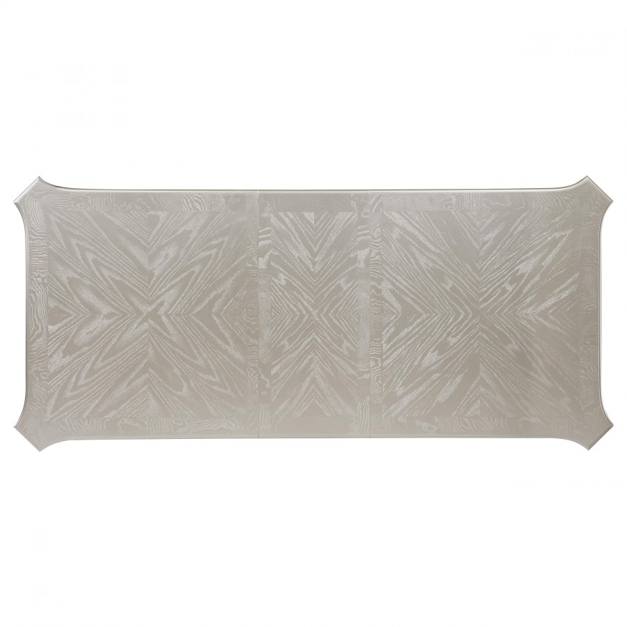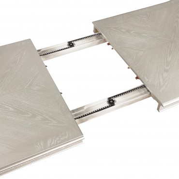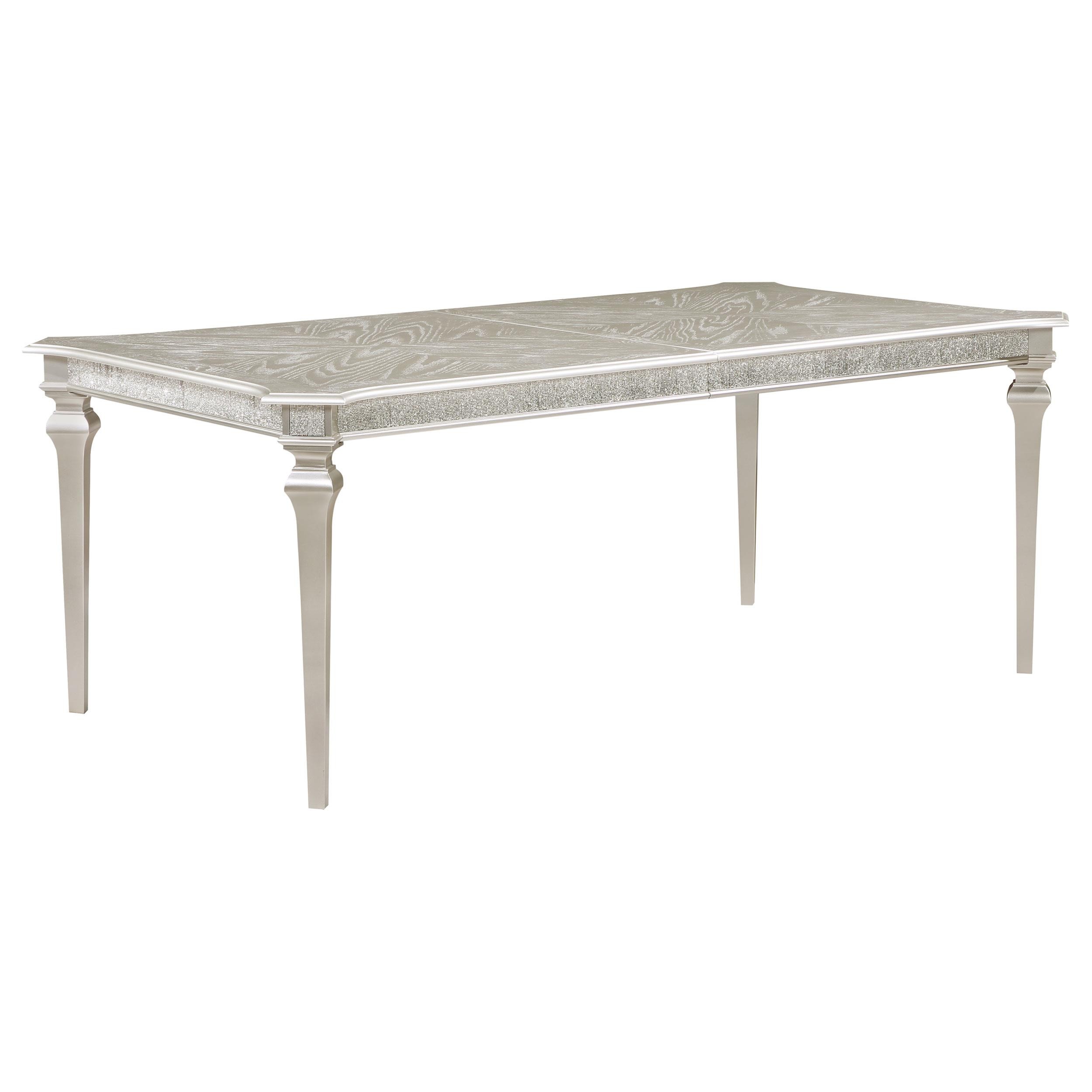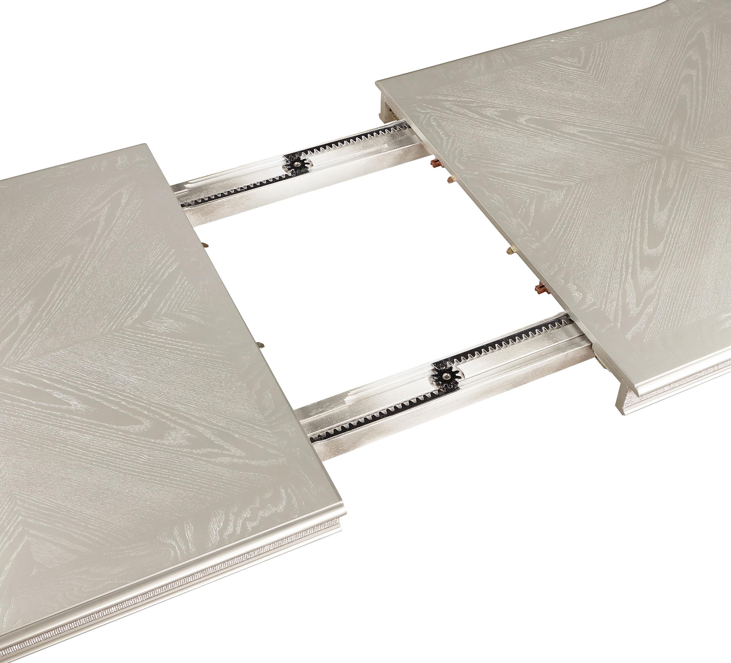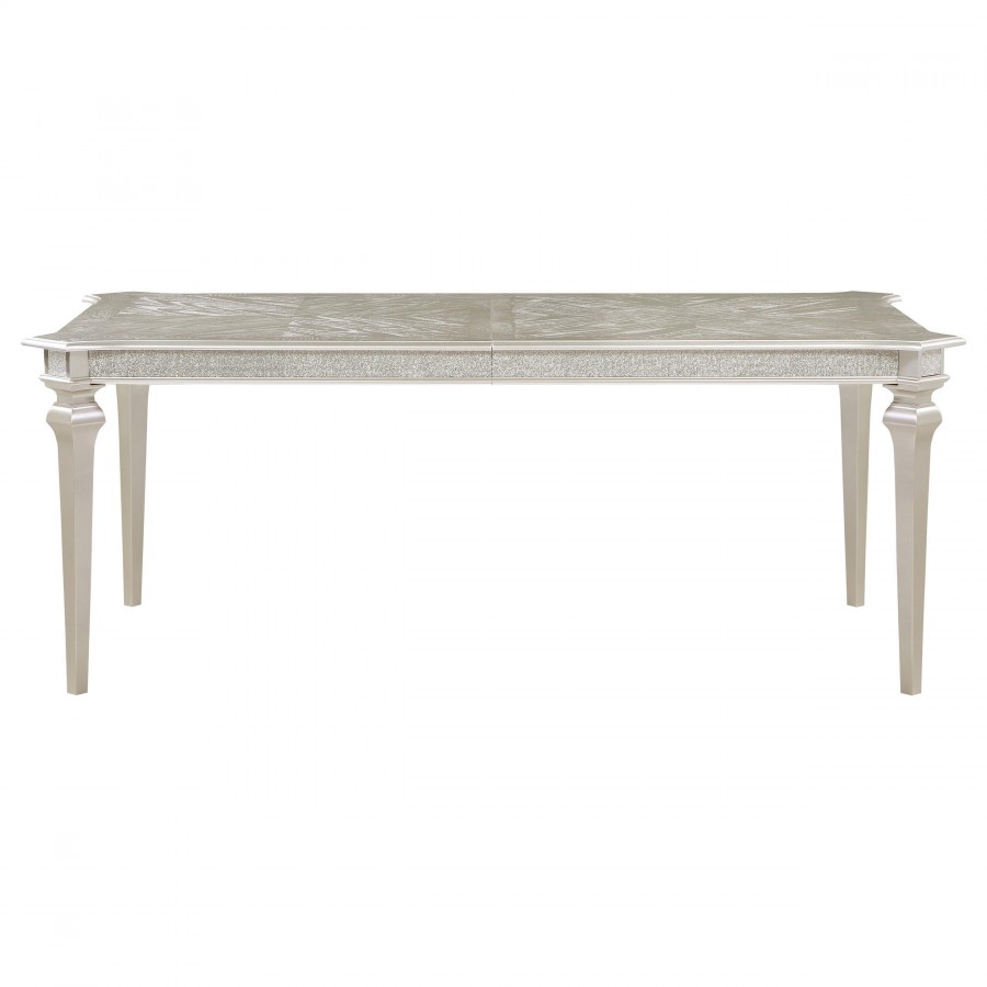 Elevate your dining area with our luxurious Evangeline dining table. Boasting attention to detail with faux diamond-trim around the table, this collection includes an 18" removable leaf to comfortably seat up to eight guests, and grey felt-lined top drawers with tinted drawer boxes in the server for added luxury.