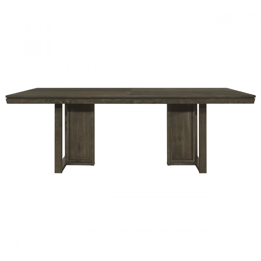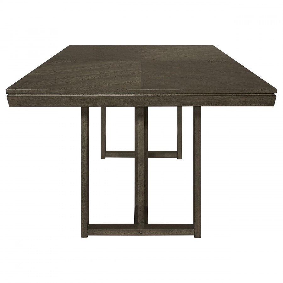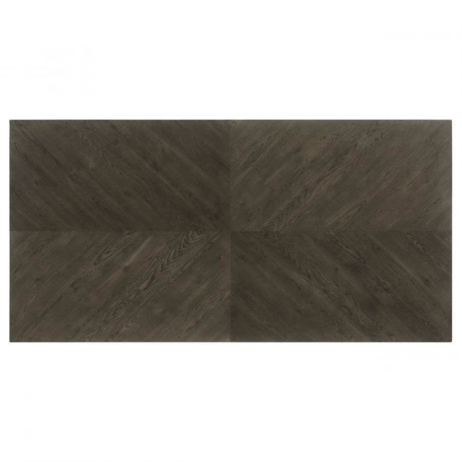 Take your dining experience to new heights with our chic transitional table. The sleek dark grey finish, adorned with a subtle chevron pattern, adds a touch of elegance to any space. The table's simple trestle base design brings a modern touch, completing the sophisticated look. Elevate your dining area with this exquisite table, where style meets functionality for unforgettable gatherings.
