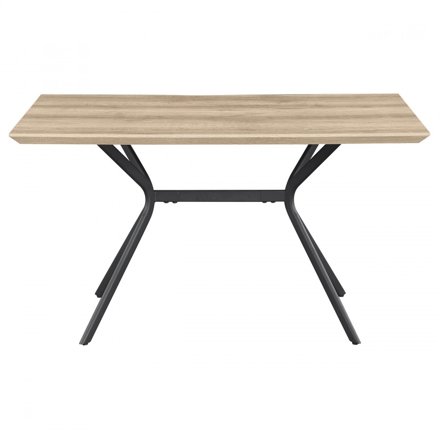 Freshen up your kitchen or dining room with a modern casual dining table. Its rectangular silhouette is versatile and stylish, perfect for multi-functional spaces like breakfast nooks and compact dining rooms. It boasts a medium brown wood grain tabletop finish, crafted with melamine for excellent durability and resistance to denting and scratches. An angled edge adds polished flair, perfect for an approachable, contemporary space. The table's base features four angular V-shaped legs with a crossbar support, all in a black finish over metal construction that provides stability.