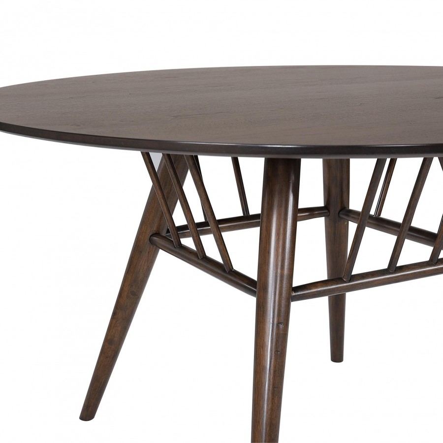 A charming basket detail adds to the mid-century charm of a round dining table. The wood table features a sap walnut veneer tabletop with a deep, rich walnut wood finish, creating a refined touch in your kitchen or dining room. Underneath, flared legs feature a tapered silhouette, offering stability and a stylish look and feel. The openwork spindle detail under the tabletop creates texture and depth, ensuring a table that stands out in your home. This charming table is sized for four, offering a great fit in a kitchen or dining room.
