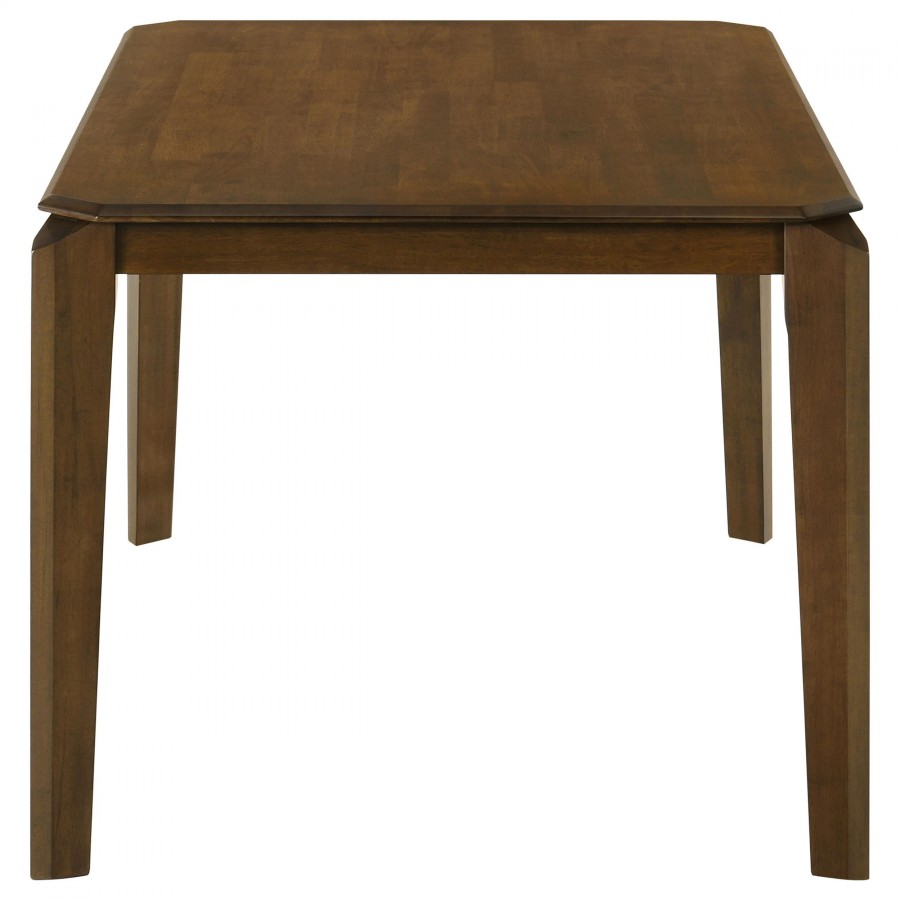 Center your stylish dining room on the angular silhouette of a modern rectangular dining table. Perfect for family gatherings and daily meals, it boasts a dark brown wood finish over rubberwood, delivering excellent style and durability. The rectangular table featured a chamfered edge that augments the flared design and almost faceted look of its four support legs. The legs protrude beyond the tabletop, while a recessed apron completes the look with familiarity. The table comfortably seats four to six, perfect for your breakfast nook or dining room.