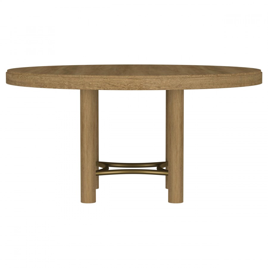 Graceful curves and natural textures define this round dining table, where rustic warmth meets modern refinement. A sand wash wood finish softens the white ash veneer top, while the sculpted base is anchored by cylindrical legs and a gently arched aged brass stretcher. Crafted from solid rubberwood and engineered wood, this table invites relaxed gatherings and everyday elegance with its timeless, welcoming design.