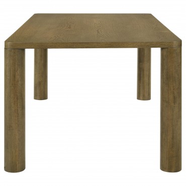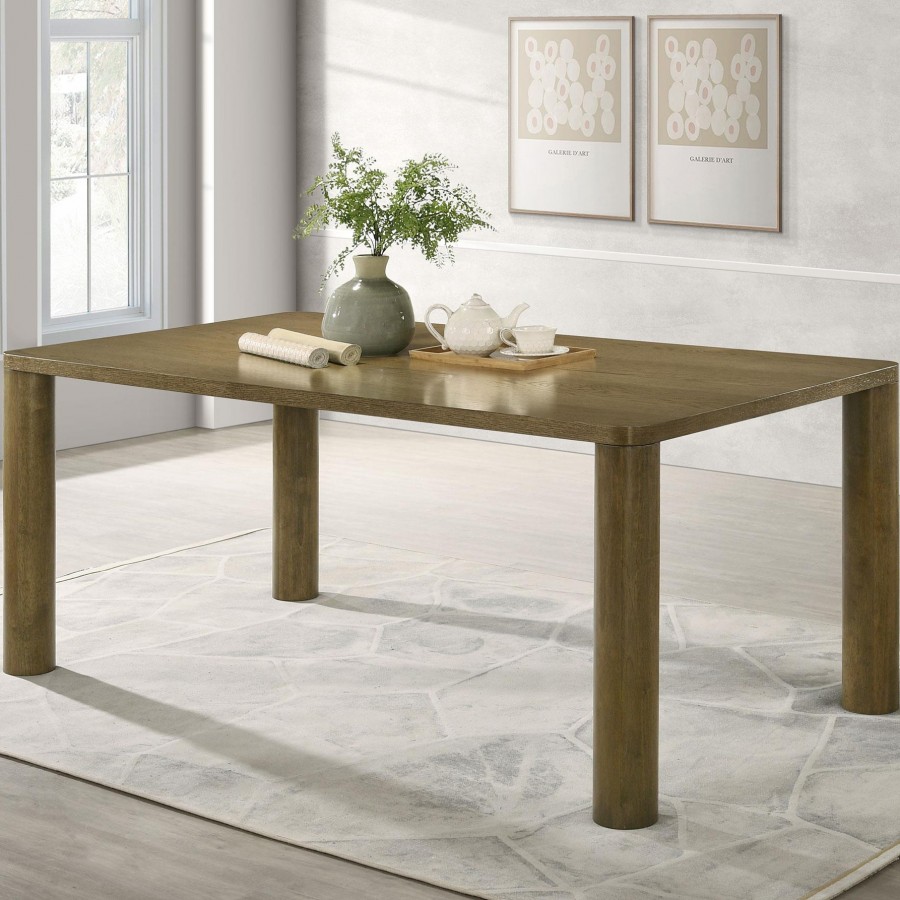 Create an inviting focal point in your dining room or breakfast nook with a modern wood dining table. Its rectangular profile is the ultimate in versatility, perfect for savoring meals with friends and family. A brown finish over oak veneer brings inviting natural character to the table, perfect for daily and special occasion enjoyment. The table boasts a simple silhouette, complete with a square edge and round post legs. The rounded corners of the tabletop soften the strong, robust look and feel of this charming table.