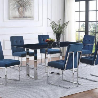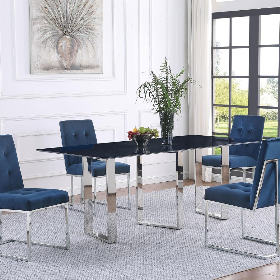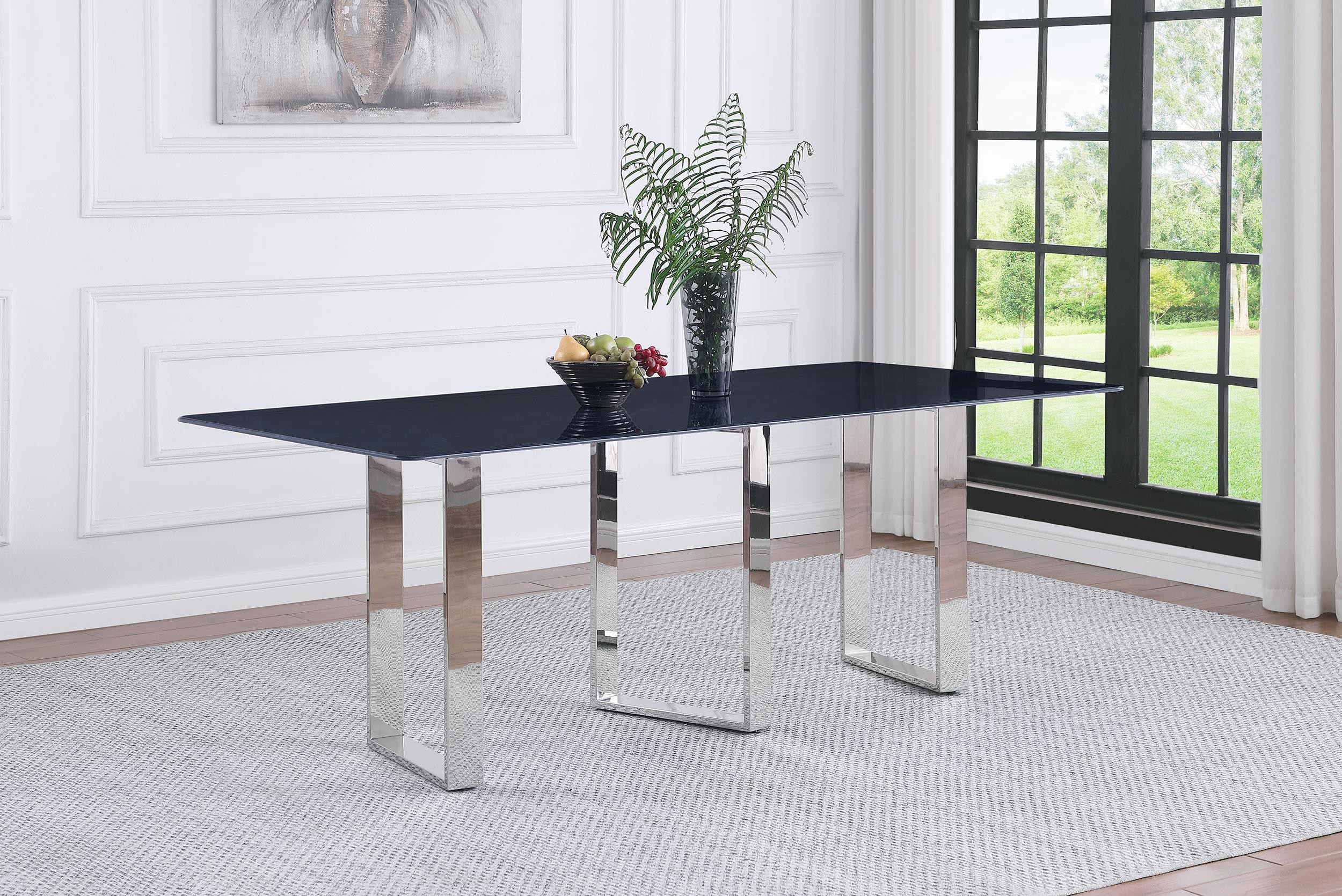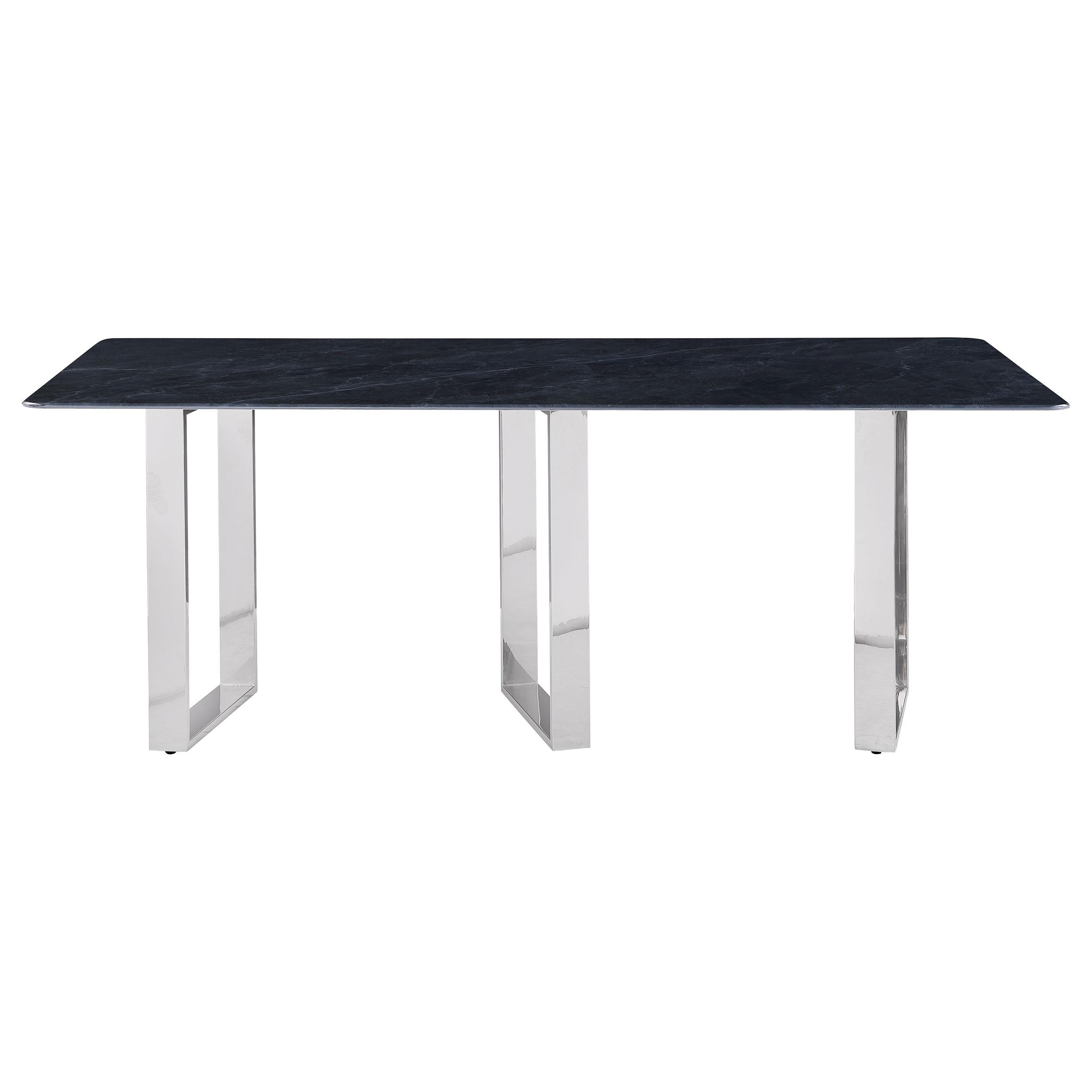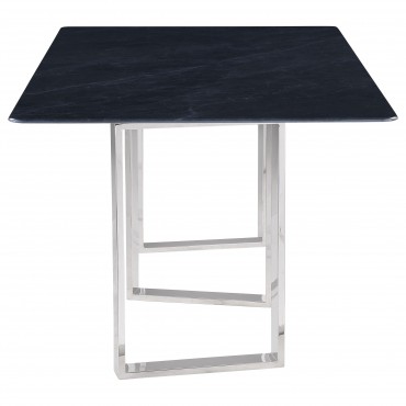 Inject a sense of sophistication with a modern rectangular dining table. Featuring a sintered stone tabletop with a gray marble finish and slim, sleek silhouette, the table becomes a stylish centerpiece in your dining room. It stands on three open frame legs that add airy, sculpted style. The angular presentation of its legs adds intriguing visual dimensionality in any dining room. A polished silver-tones finish is timeless and refined, perfect for your space.