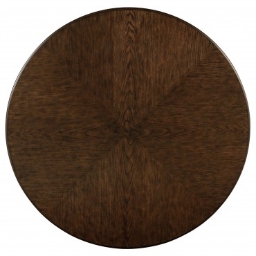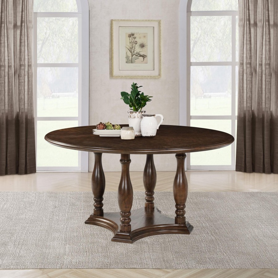 Upgrade your kitchen or dining room with the classic design of a round wood dining table. Crafted with oak veneer in a rich brown finish, it imparts elegance with subtle trim details and its depth of color. The table boasts a decorative base design with a cluster of four turned-style legs on a curvy base with scallop details. The roomy table is ideal for family meals, entertaining friends, and even for game nights and homework. Add a vase of fresh-cut flowers from the garden for timeless decoration.