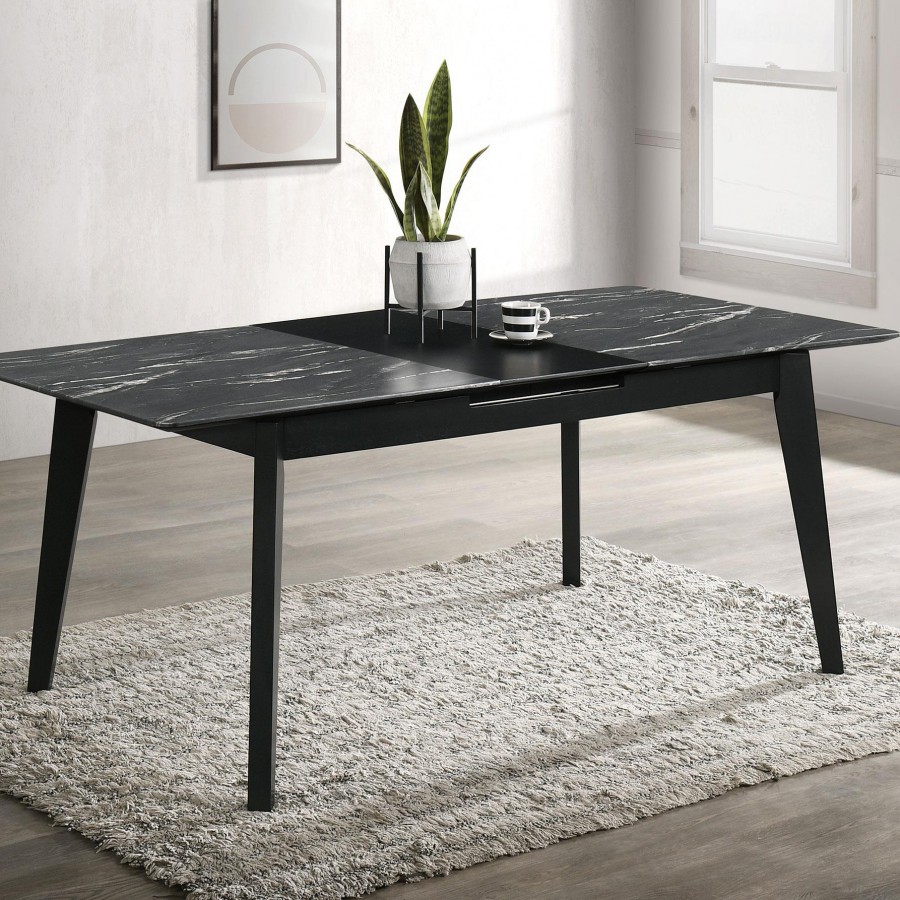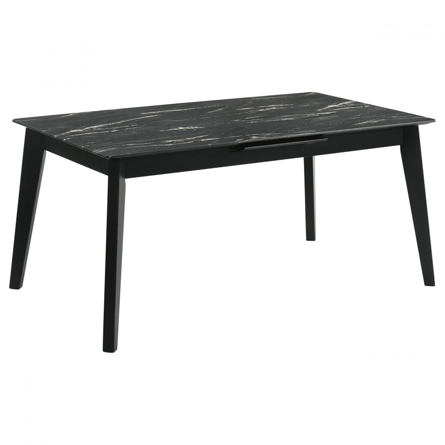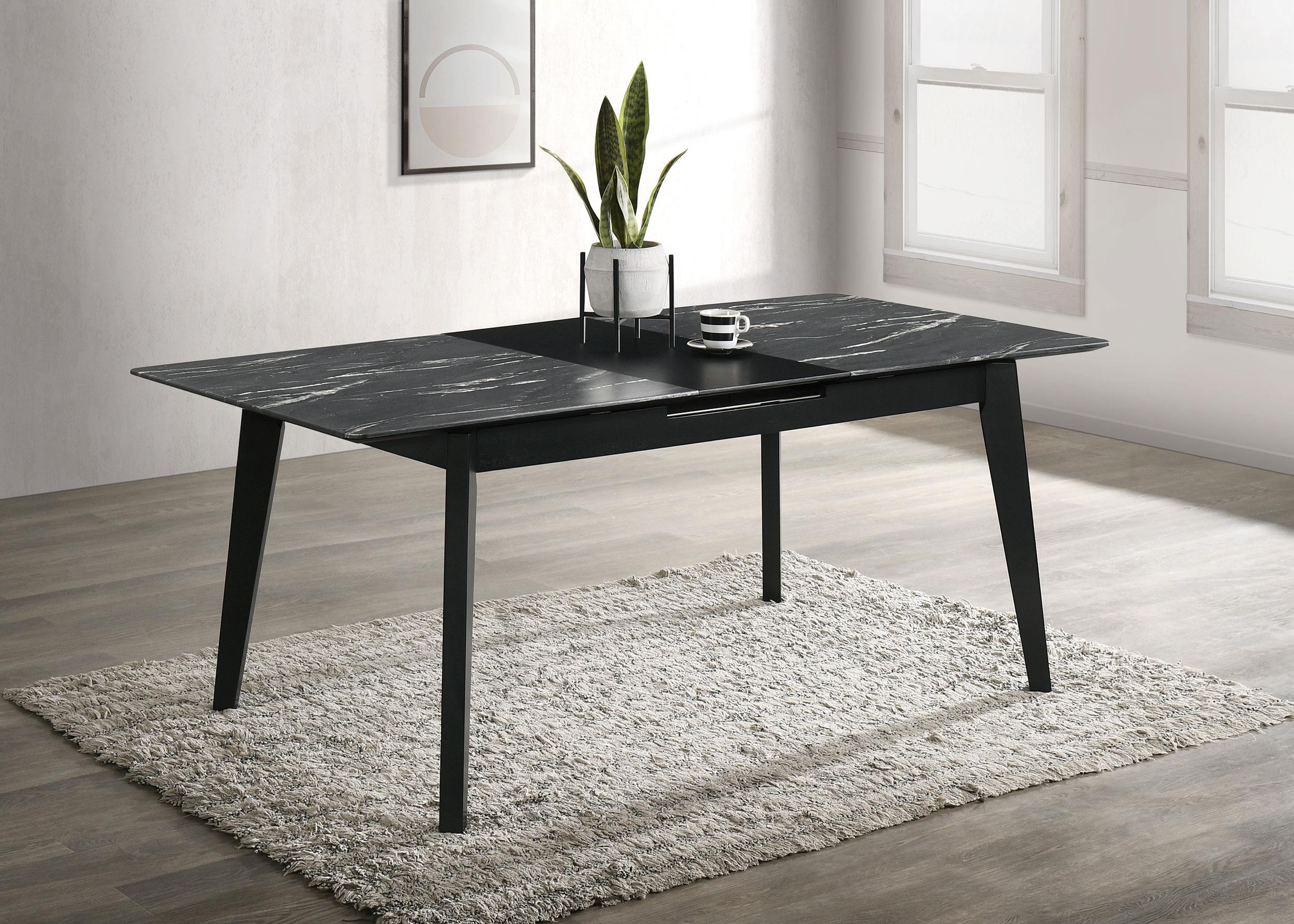 The luxurious look of faux marble creates a glam sensibility for a modern dining table. The black marble look of the tabletop complements a sleek base with fin-style legs and a recessed apron. The table includes a self-storing leaf for easy expansion to accommodate guests or the family. Its black base finish is crisp and classic, offering timeless elegance that never goes out of style. It's the perfect way to bring fresh, modern energy to your dining room.