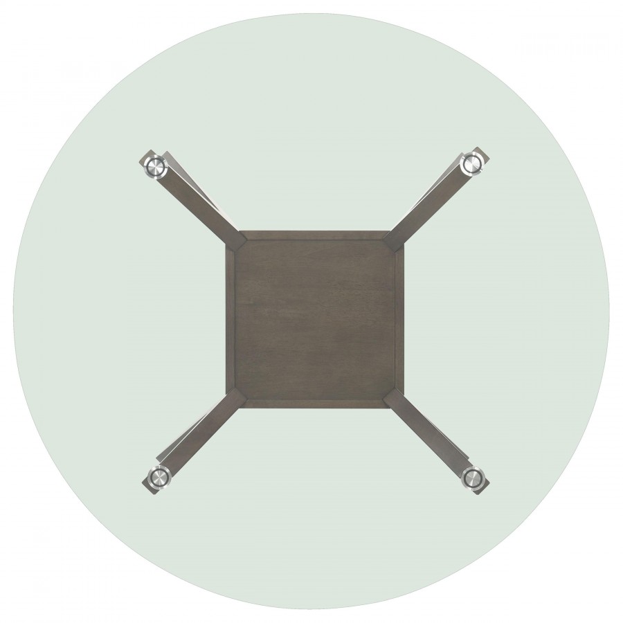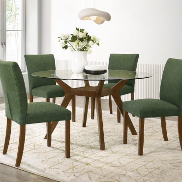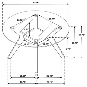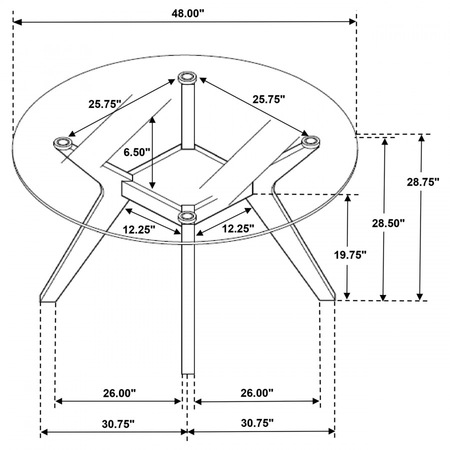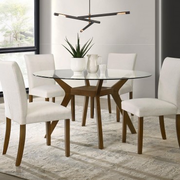 Gather for delectable meals and captivating conversations with the exquisite Paxton collection's contemporary dining table. The table stands gracefully on four angular legs, a captivating display of geometric elegance. Converging in a junction adorned with a square shelf, the legs exude architectural charm. Crowned by a 48" round clear tempered glass top, the table's surface is not only visually pleasing but also effortless to upkeep, seamlessly complementing diverse decors. The warm brown wood finish adds an inviting touch, completing this stunning dining ensemble with a flourish of sophistication and comfort.