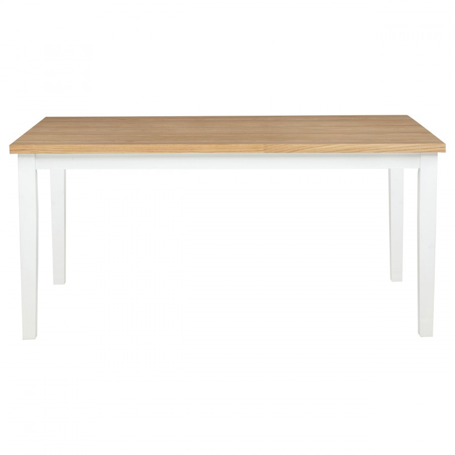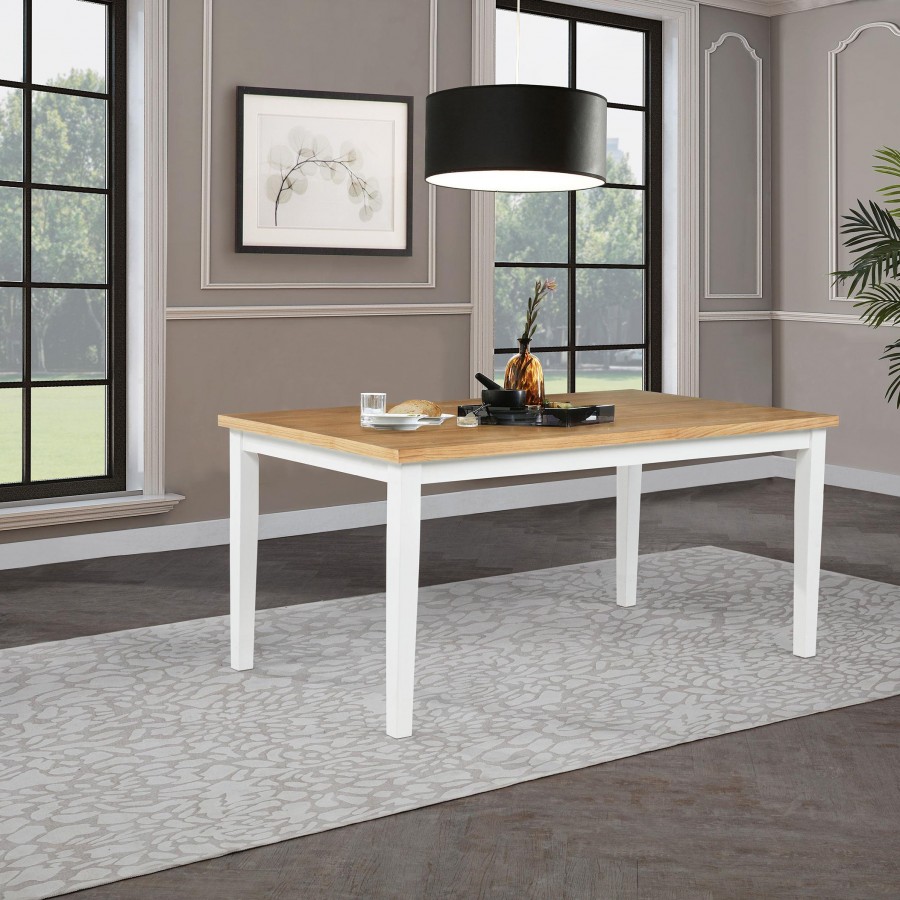 Timeless and inviting, this rectangular dining table pairs warm wood grain with soft white tones for a refreshing farmhouse feel. A spacious top in light ash finish rests on gently tapered white legs, creating a charming two-tone silhouette. Crafted from solid rubberwood with ash veneer over engineered wood, it offers strength and style in equal measure. Perfect for kitchen breakfasts, family dinners, or laid-back gatherings with friends.