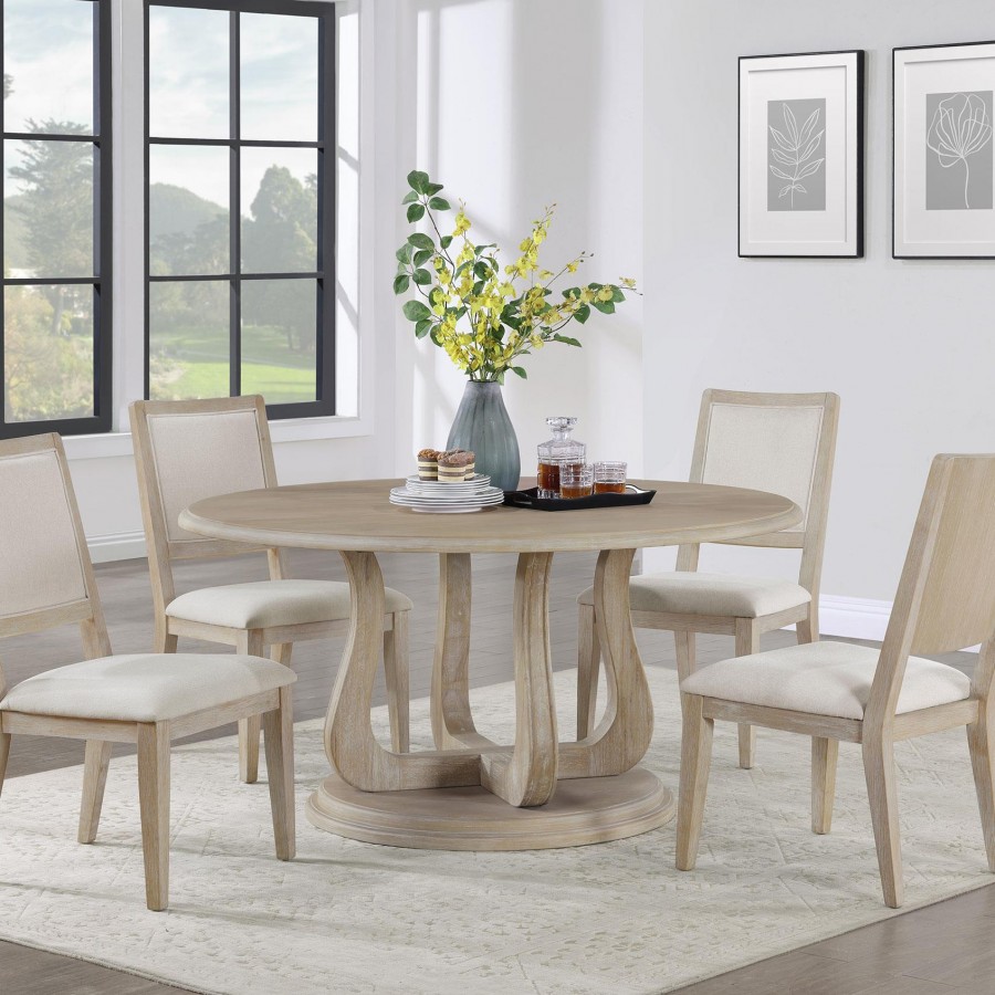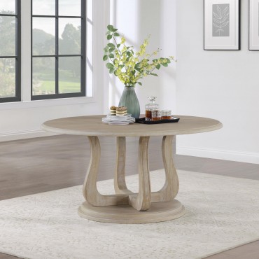 Design your inviting dining space around this modern farmhouse round dining table. Its welcoming ambiance is encouraged with its silhouette, creating a perfect spot for family dinners and easy-going conversation. The table features a decorative base with pedestal style despite its four curvy, flared legs that lean toward a classic look. It features hardwood construction with veneers, all in a white finish with wire brushing that create a distressed, lived-in look and feel. Adda vase of fresh cut flowers or stylish linens and you're all set to go.