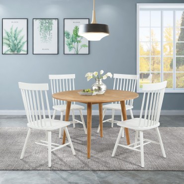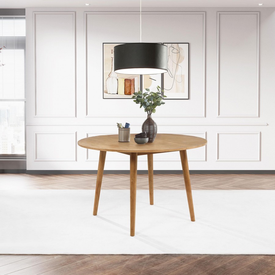 A graceful blend of simplicity and warmth, this round dining table evokes mid-century charm with its smooth circular top and tapered legs. Crafted from solid rubberwood with ash veneer over engineered wood, it showcases a radiant wood grain beneath a light ash finish. Designed for cozy gatherings and everyday meals, it brings soft elegance to breakfast nooks, dining areas, or open-concept kitchens.
