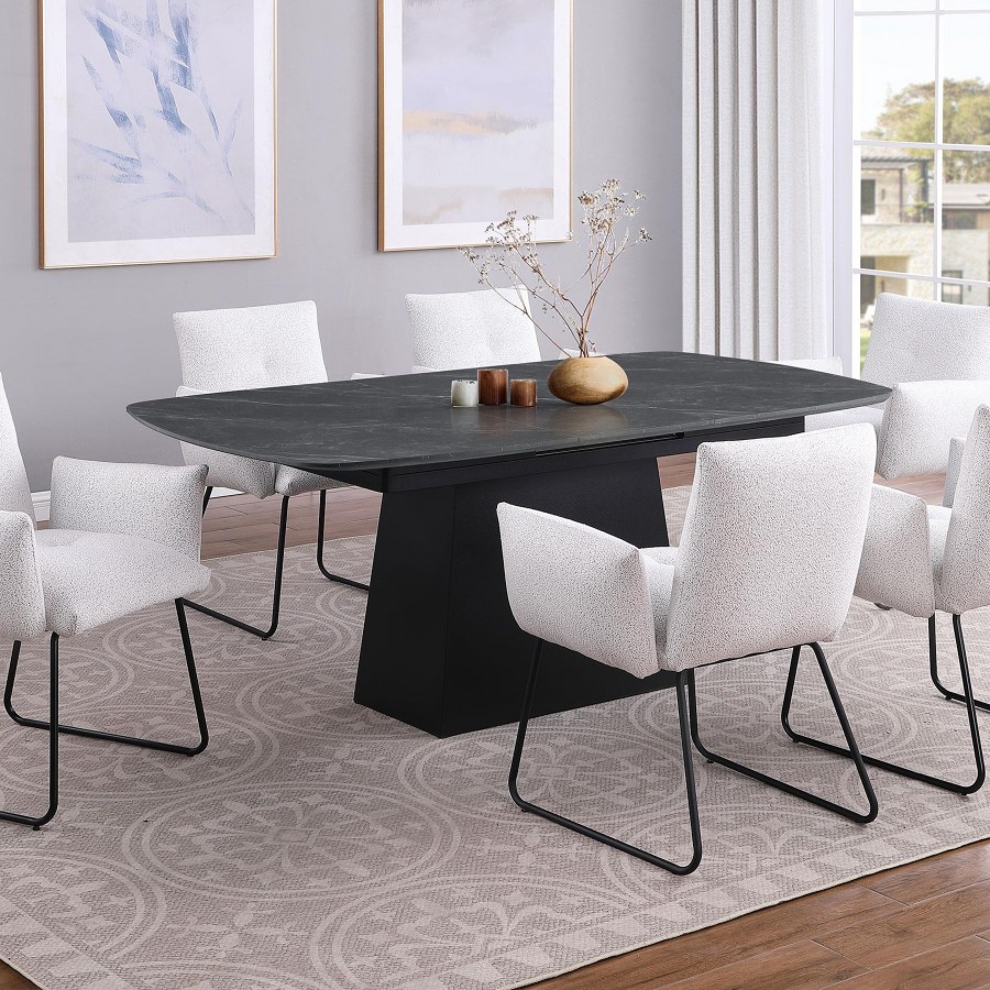 This modern dining table blends sleek aesthetics with functional versatility. The black marble-printed melamine tabletop offers a luxurious look while being scratch- and water-resistant for everyday durability. Its expandable design includes a 15.75-inch self-storing leaf, allowing the table to extend from 57 inches to 72.75 inches to accommodate additional guests. A bold, trapezoid-shaped base with a black hammer-tone powder-coated finish provides sturdy support, making this table a stylish centerpiece for contemporary dining spaces.