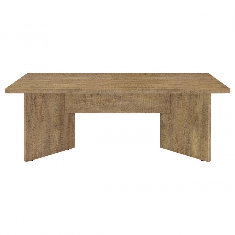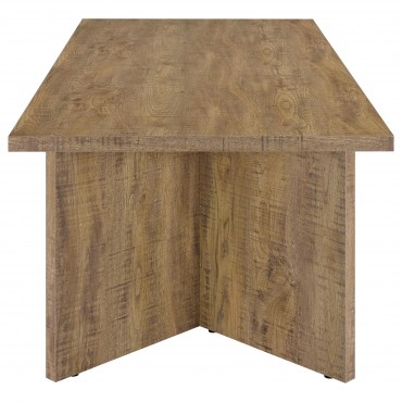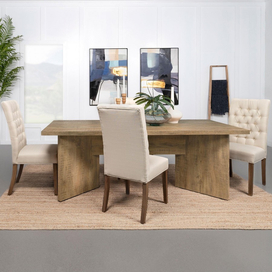 Sit down to delicious meals at a stylish, casual contemporary dining table. The classic rectangular table design features a mango wood-like decorative paper veneer that imparts character with its impressive dimension and texturing. The engaging table design is elevated with a pair of V-shaped pedestals connected with a support plank to create a bold, geometric look to center your kitchen or dining room. The table provides plenty of space for family and friends with its versatile size. Add a ceramic centerpiece to perfectly complement the earthy, organic look.