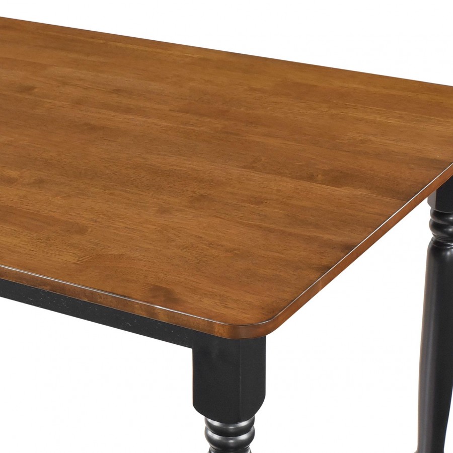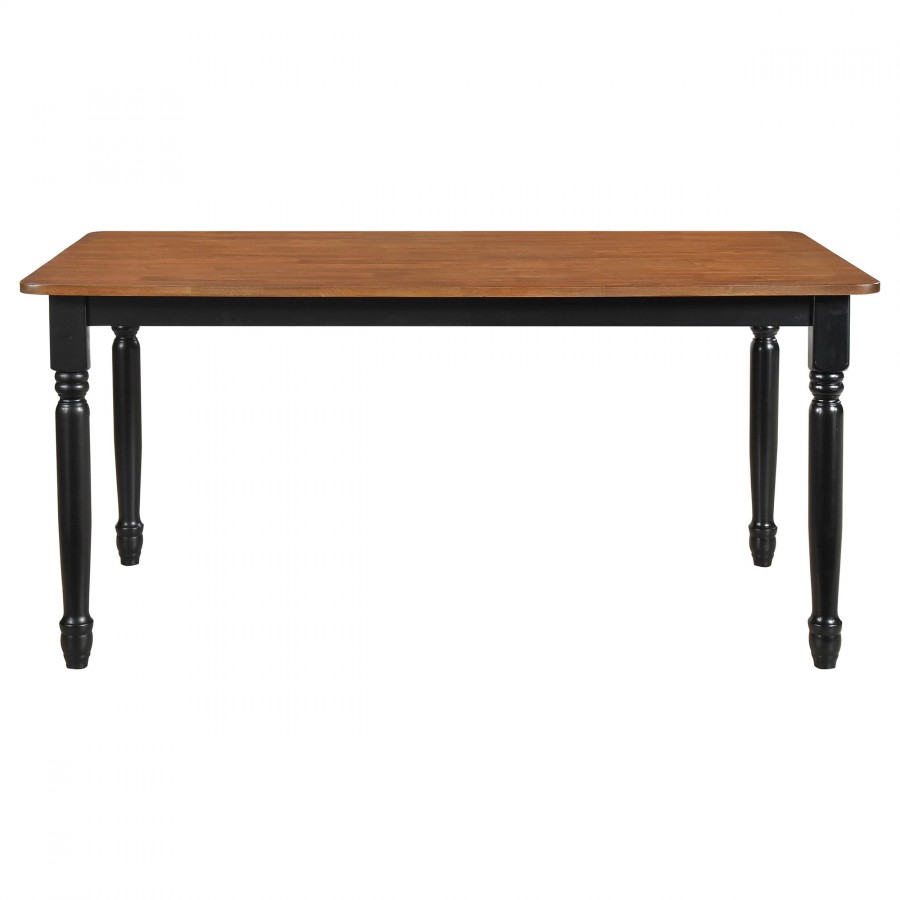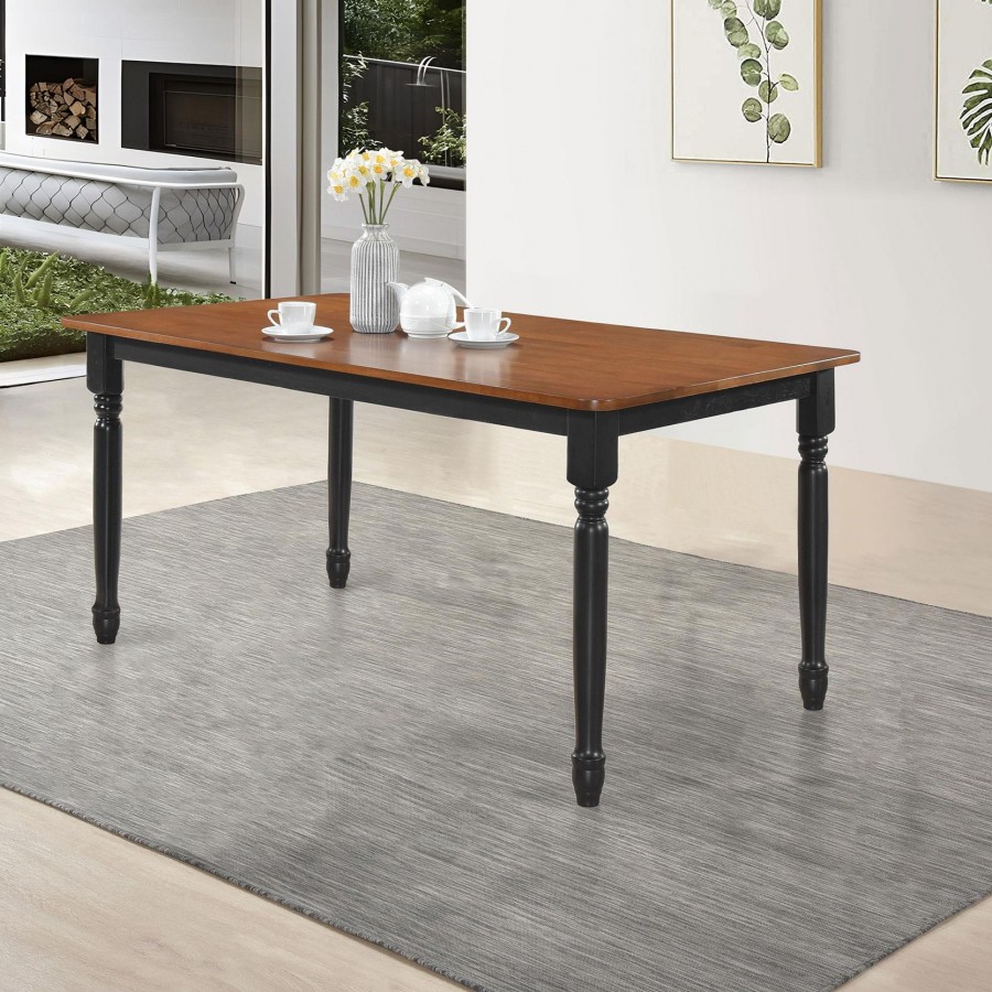 Enjoy gatherings for meals and conversation at this traditional dining table. A charming addition for a welcoming space, it features a compact rectangular profile perfect for four or six, with a distinctive two-tone look that catches the eye. The table features a walnut finished table top that's warm and inviting, with a black finished base that adds a touch of drama. Turned style legs add an artisan inspired touch, perfect for refined flair in a casual cottage or farmhouse dining room. The table is expertly crafted with rubberwoods for exceptional quality and durability.